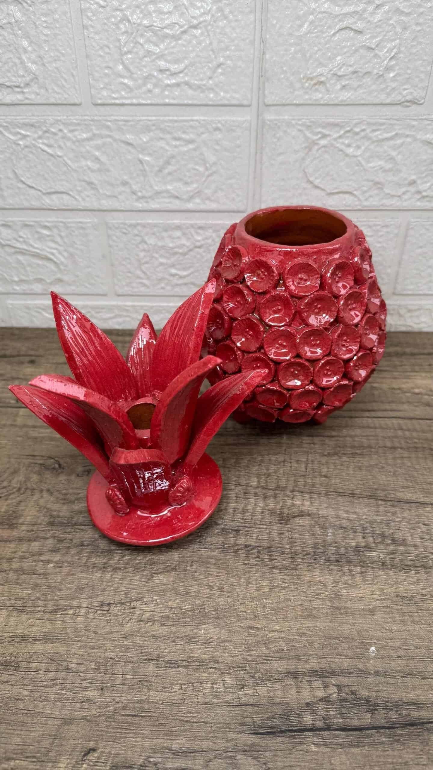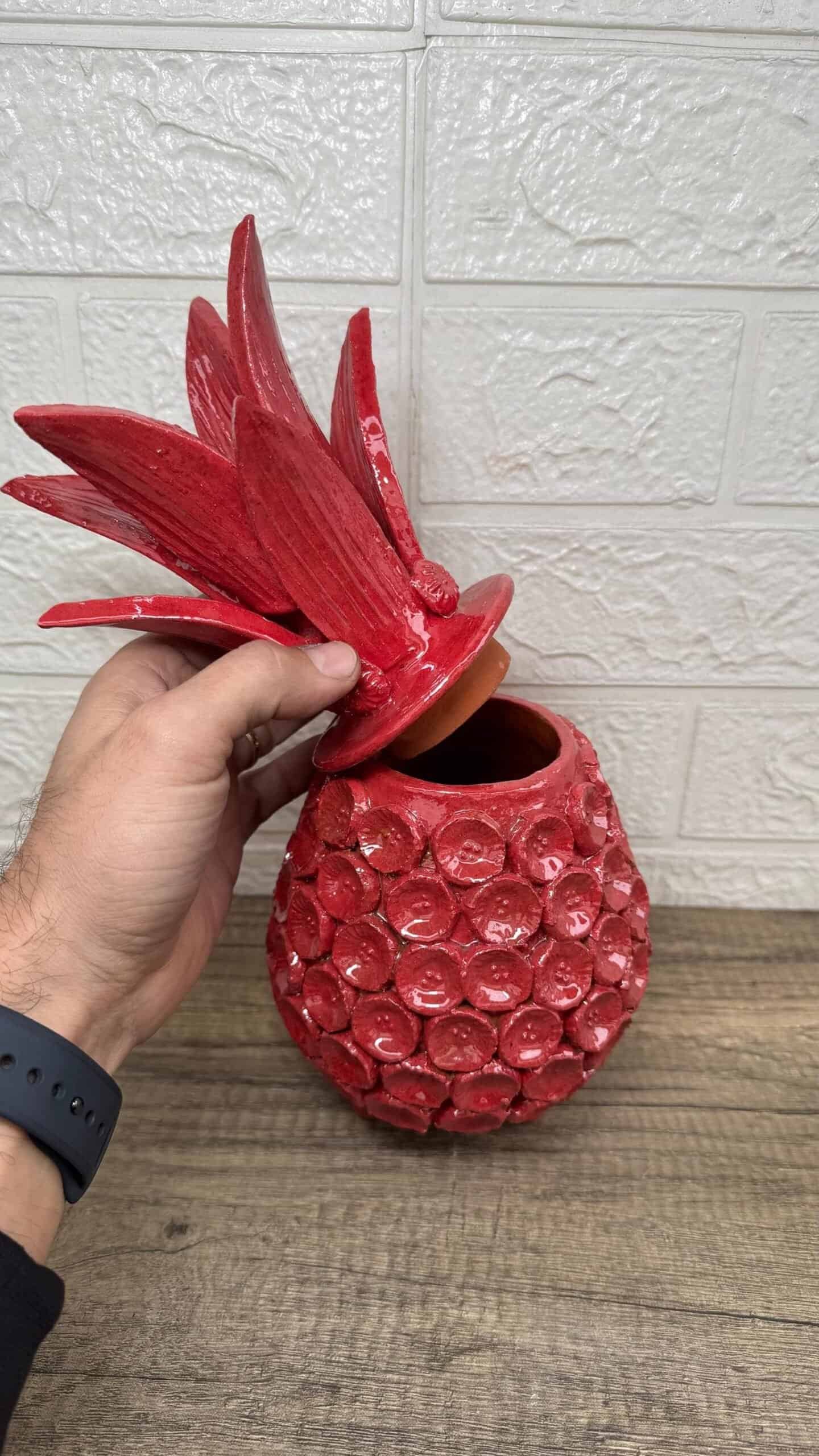 The pineapple sculpture of Michoacan is distinguished in Popular Art in Mexico not only for its quality, but also for the ancestral techniques they use, making a fusion of prehispanic techniques. Glazed clay, named for its glazed, glass-like appearance. The potters’ process consists of applying to the clay pieces, after their first firing, a film or layer that, after melting in an oven, takes on a crystalline appearance. It is therefore a smooth and waterproof coating achieved in a second firing that must reach 800 °C to 1300 °C. ______________________________________________________________________________________________________________________________________________________________________________________________________________________ This beautiful decoration pineapple can be used as a home decoration, the top of the pinecone can be removed to store items inside. By buying one of these pieces you support the families of artisans who work in this beautiful art. ______________________________________________________________________________________________________________________________________________________________________________________________________________________ IMPORTANT NOTE: – Please note that as this is a handmade enameled piece there may be some imperfections. – All our fragile products, we pack them with special materials to guarantee their protection, if there is any problem with your package, please contact us to solve it as soon as possible. ______________________________________________________________________________________________________________________________________________________________________________________________________________________ Order carefully, we will pack ✅ Express shipping is available for an additional charge, please ask ✅ You can send this with a special dedication✅ It can be sent with a special wrapping as a gift ✅ Any questions please do not hesitate, we usually respond in less than an hour 😀