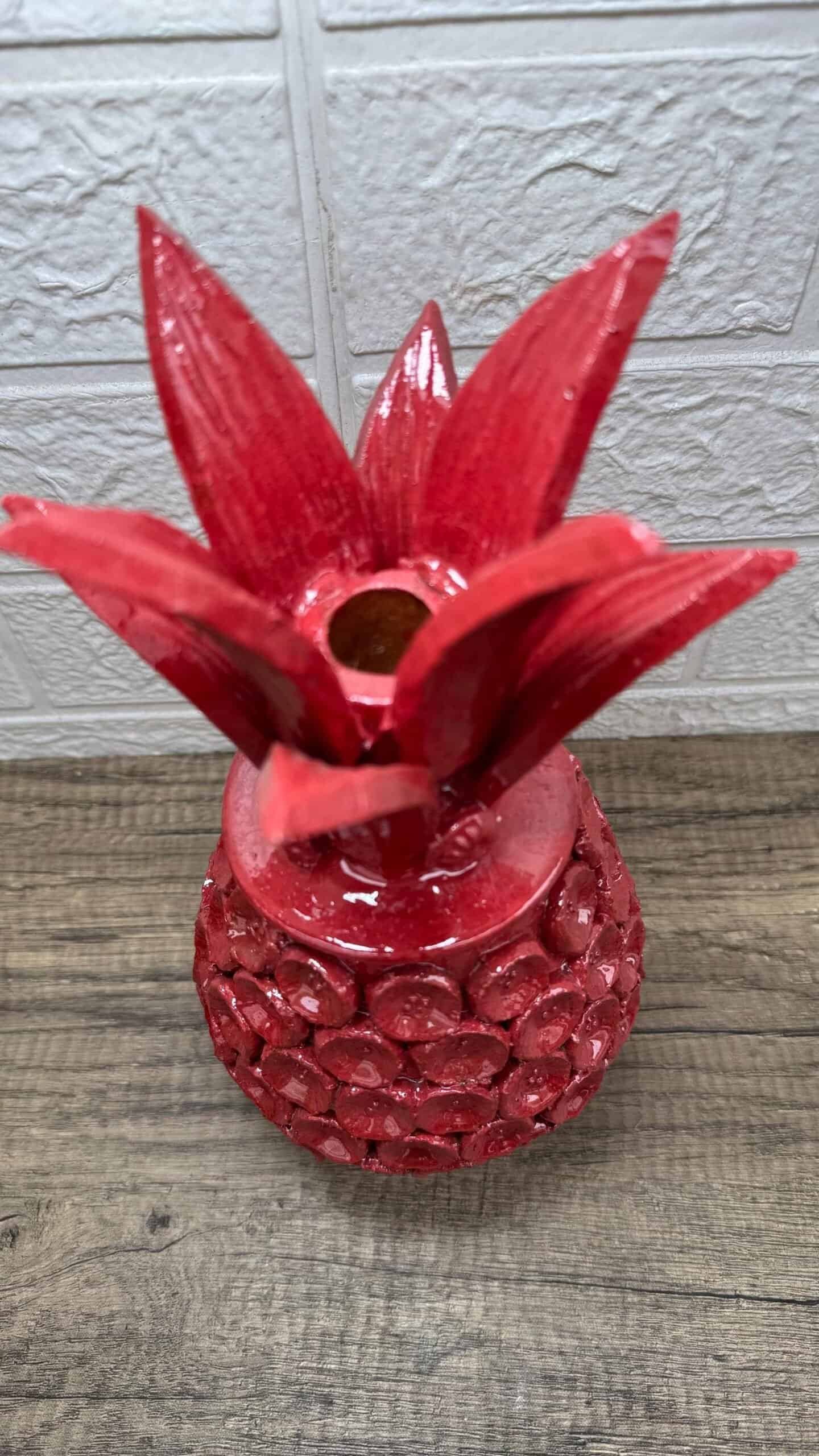 Glazed pineapple – Mexican folk pottery – Mexican folk art This pineapple decor is a unique piece, each part of the scale is made by hand, by artisans from the state of Michoacan, Mexico. Characteristic: – Size: 5.51” x 11.42” – Clay material Note: this pineapple has a hole in the top to insert a candle.