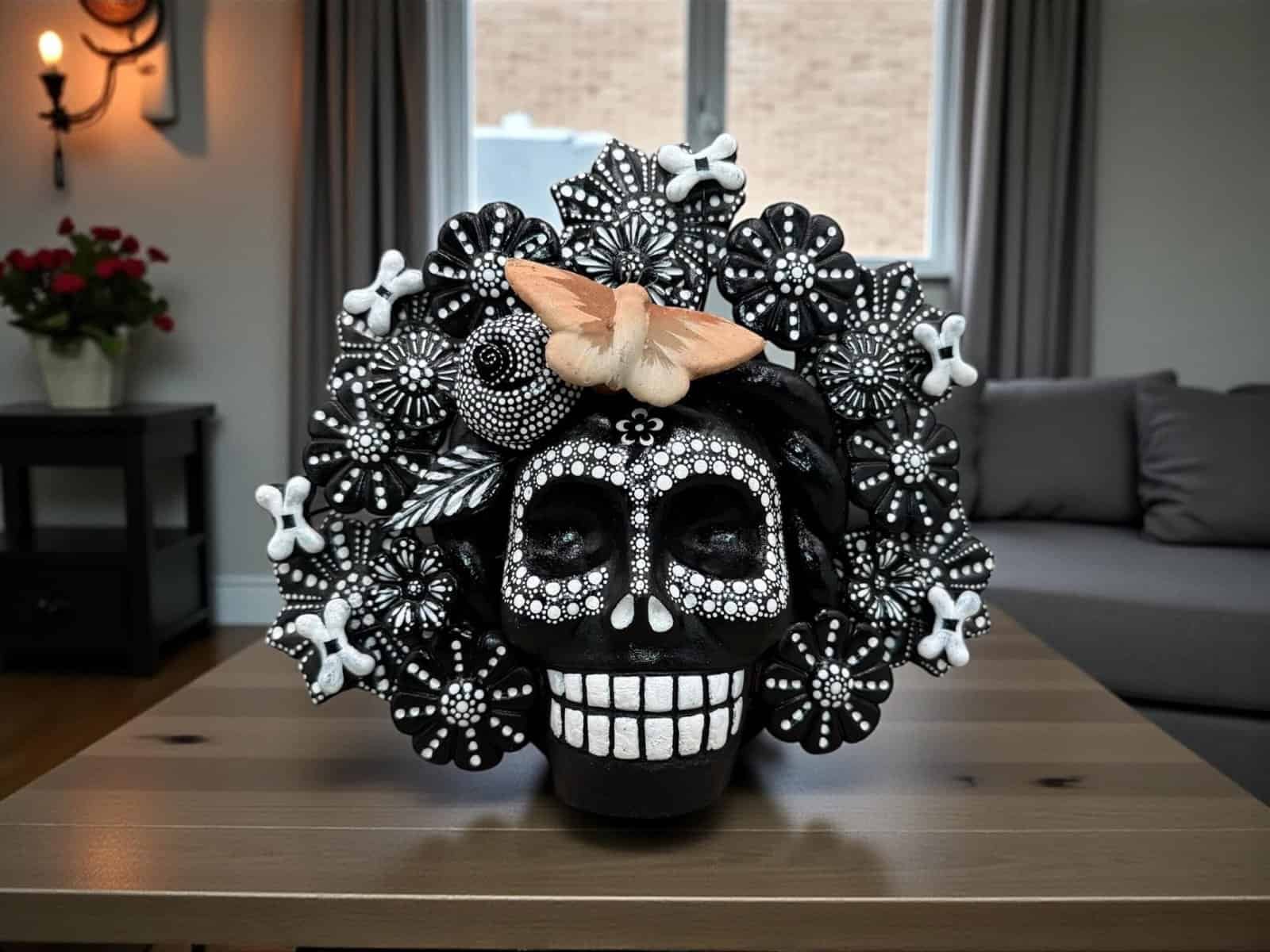 “ Sugar skull, Catrina, Mexican decoration, Day of the dead “ Clay skull with flowers decoration ideal to decorate your home or as a special gift, characteristic: – Handmade by Mexican artisans – Polychrome clay material – Dimentions Between 7” Long, 7 high 2” wide