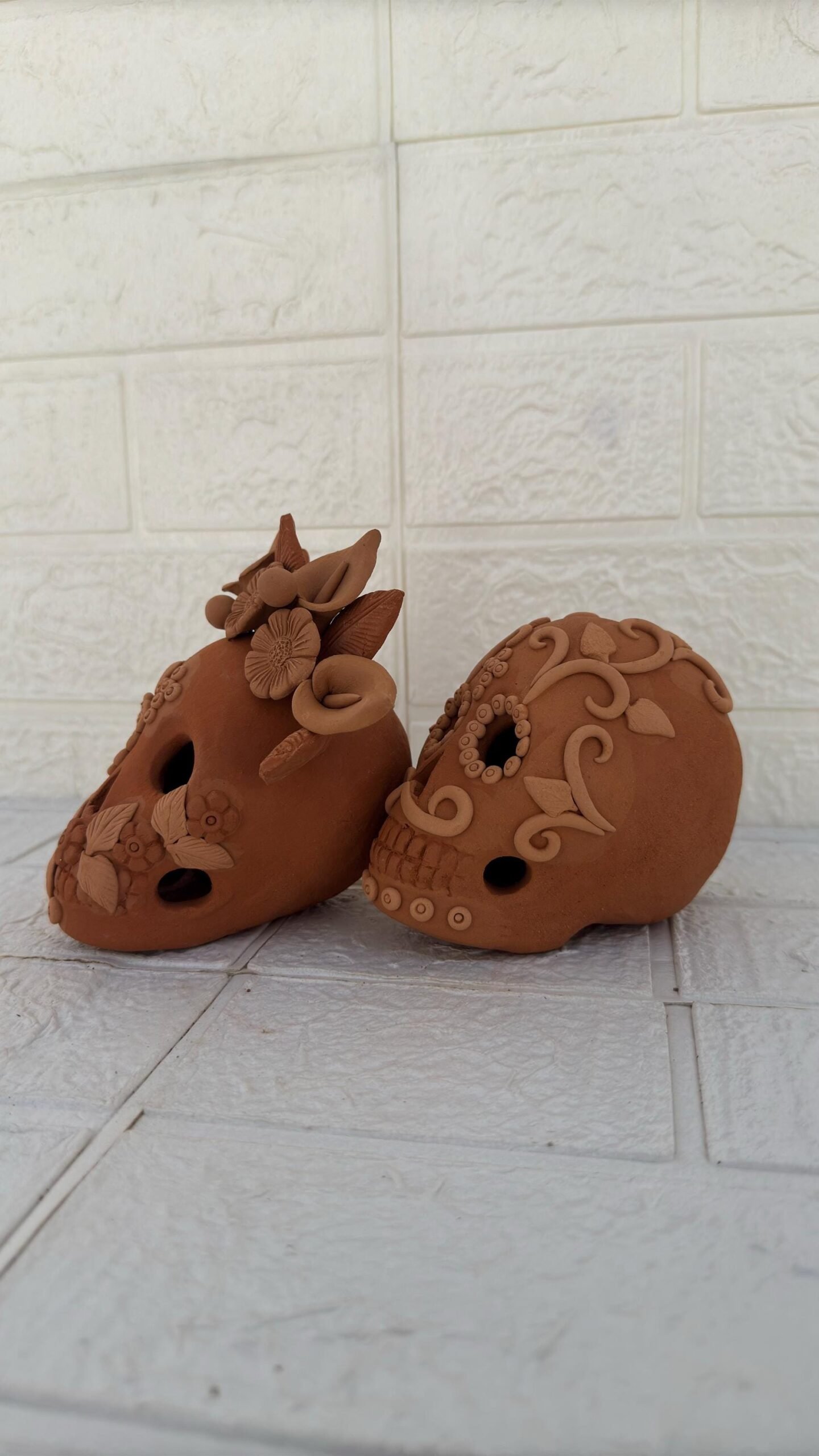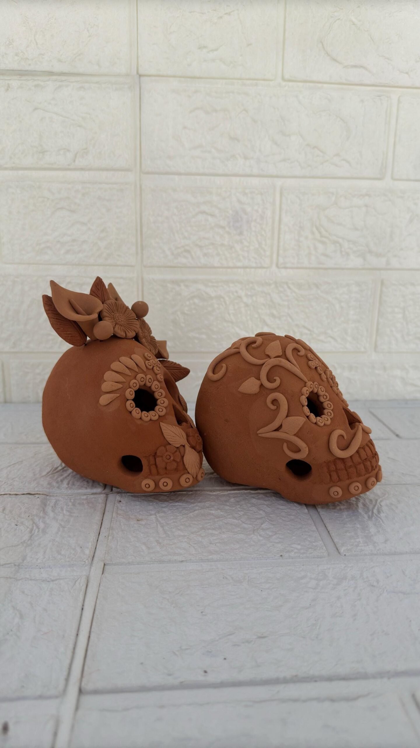 Couple Head Skull (2) Pigment Clay Skull Día De Los Muertos Frida Artistic Oaxaca México By Artisans Handmade Crafts, Home Decor Folk Art