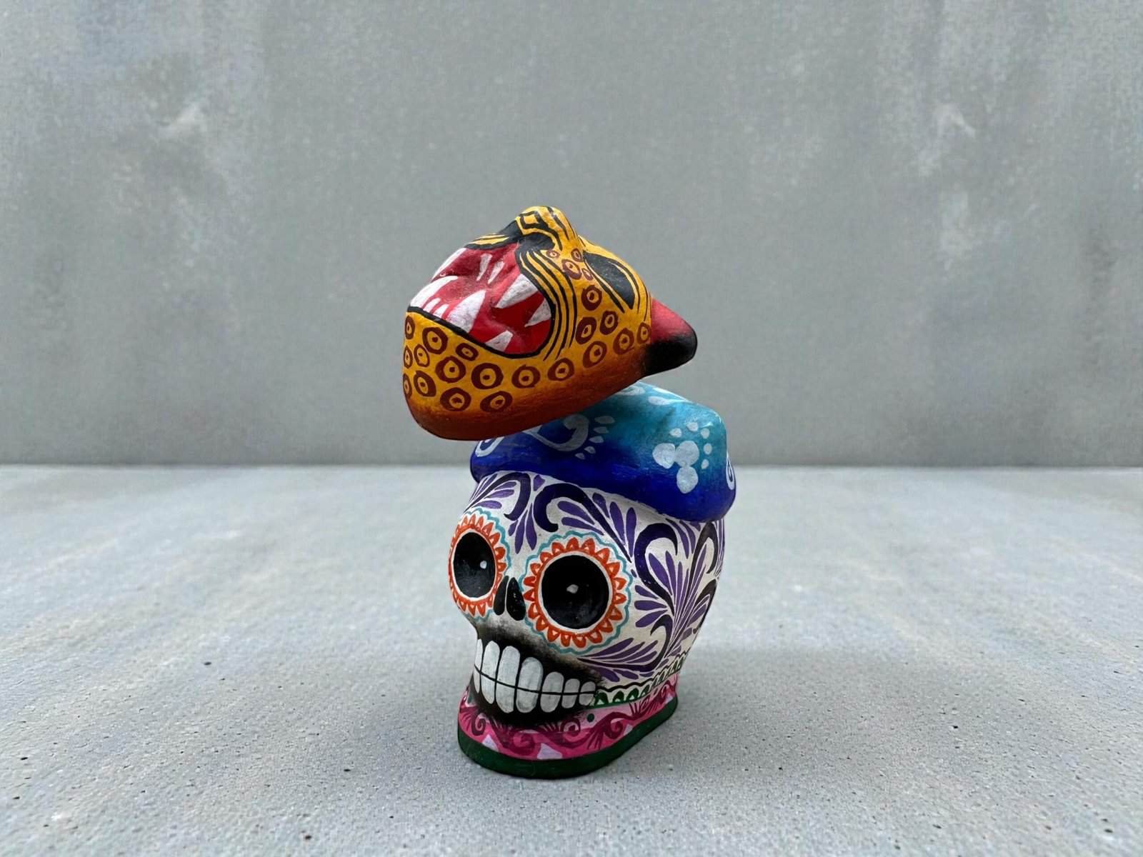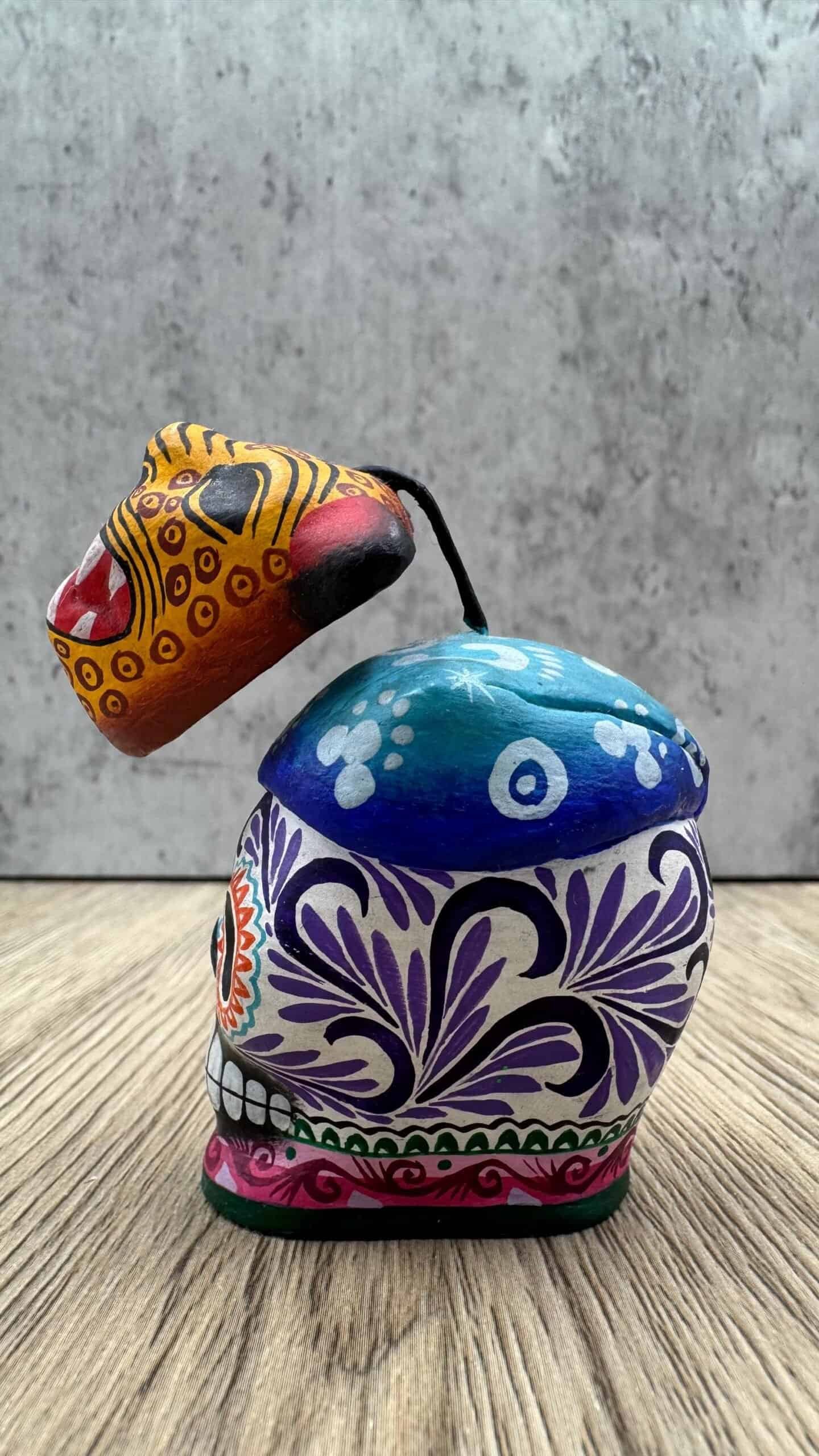 Resting on top is a beautifully painted jaguar head, a powerful symbol in Mexican culture representing strength, protection, and ancestral energy. The combination of the skull and jaguar creates a unique artistic piece that honors both Día de Muertos symbolism and pre-Hispanic heritage.