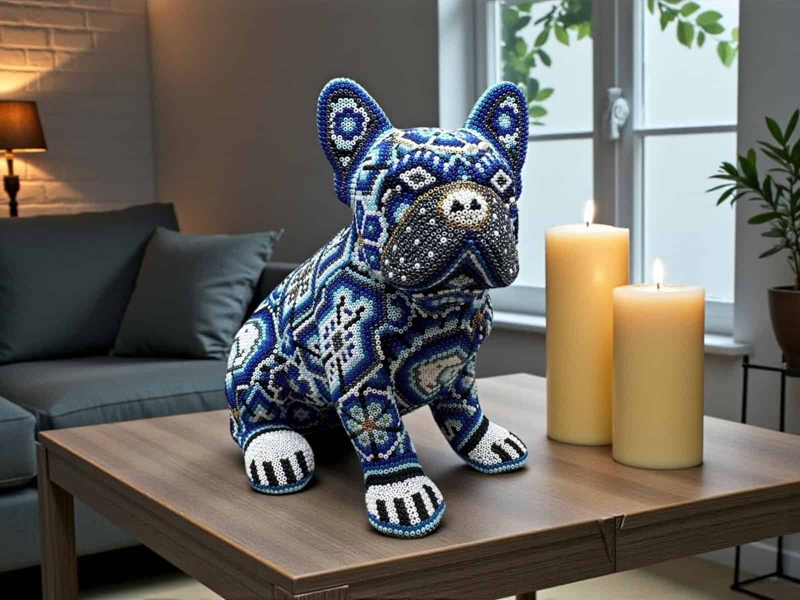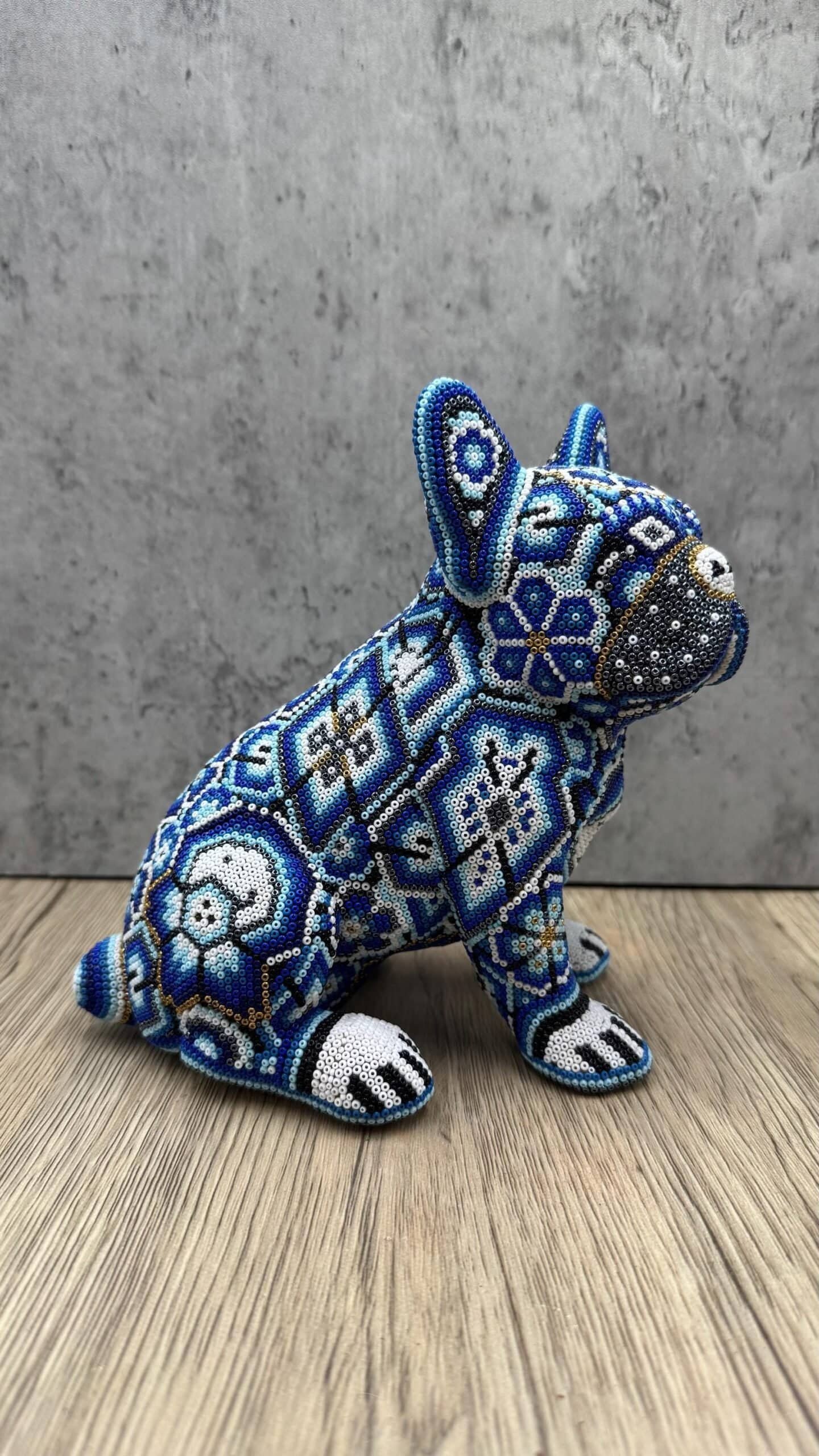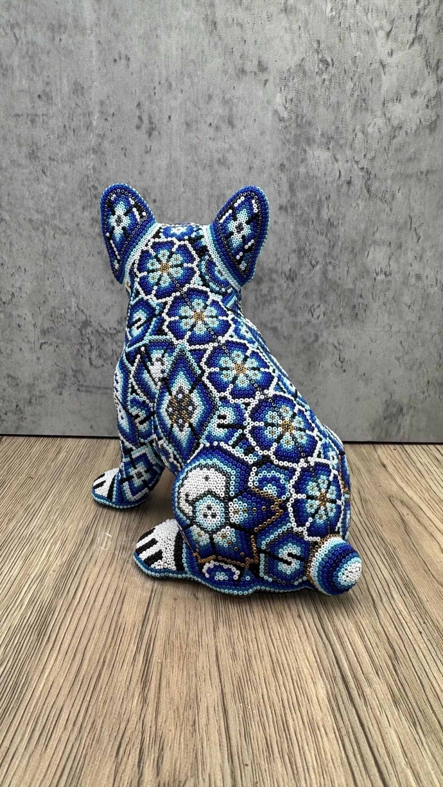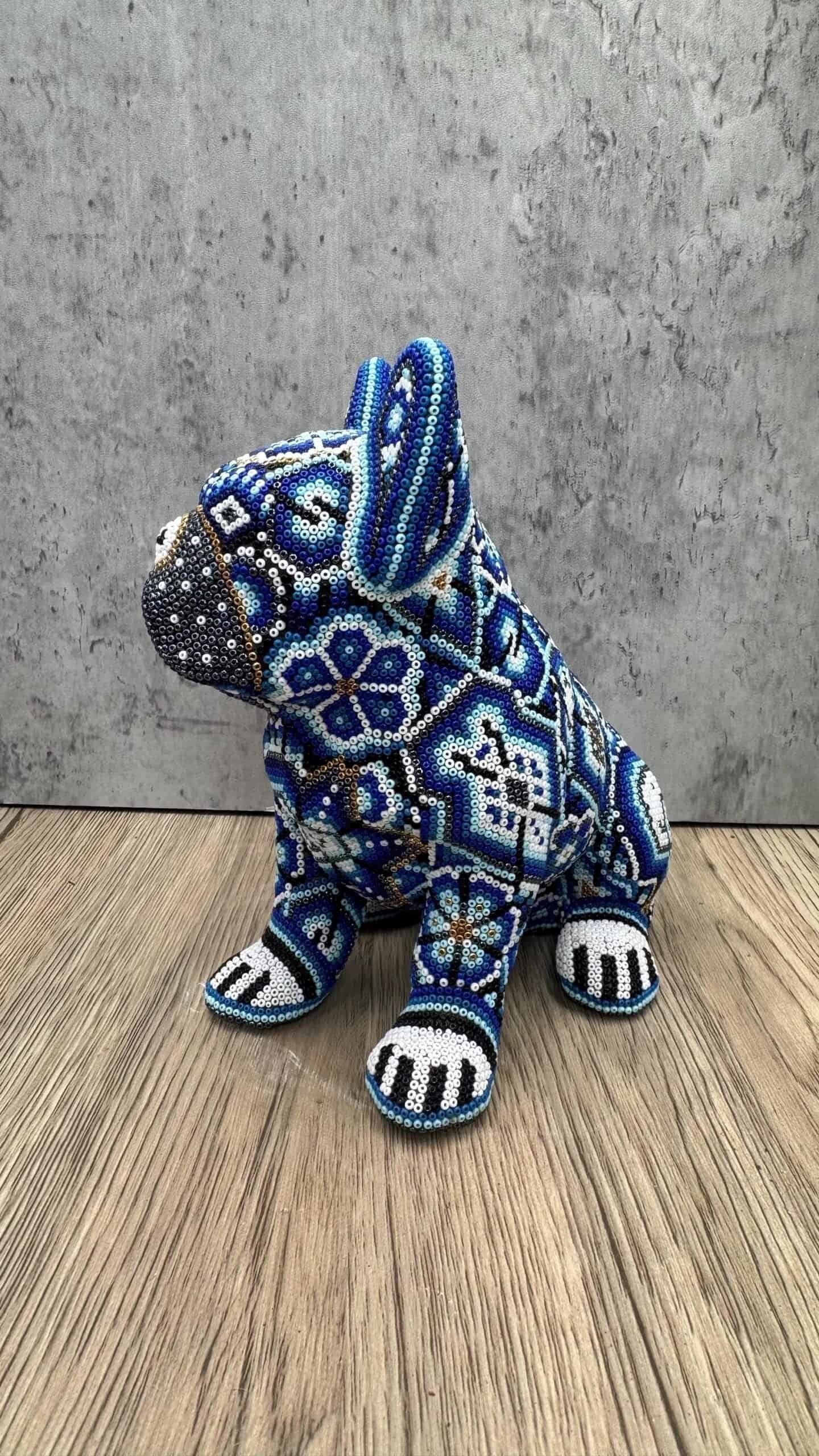 “ Bulldog Statue – Wixarika – Huichol art ” Huichol culture and Wixarica art Item Description * Mexican art * Handmade by indigenous Mexicans * Size: 4.5” wide, 7” long, 7” tall Item details * Materials: Chaquiras, sculpture in resin and Campeche wax. * Manufacturing process: Campeche wax will be evenly dispersed on the resin sculpture, this wax will serve as a glue and allow the beads to be easily placed on the surface. Order carefully we’ll packed ✅ Product in sent in a box ✅ Shipping priority mail 3-5 business days✅ Express shipping is available for an additional charge, please ask ✅ Can send this with a special dedicatory✅ It can be sent with a special wrapping as a gift (please notify)✅ Any question please don’t hesitate, we usually respond in less than an hour 😀 Wixárika Huichol bead art is a traditional form of art practiced by the Wixárika people of western Mexico. This intricate art form involves applying small glass or plastic beads to a surface, such as a wooden or gourd object, using beeswax or resin as an adhesive. The designs used in Wixárika bead art are often highly symbolic and reflect the cosmology and spiritual beliefs of the Wixárika people. Common motifs include depictions of the sun, moon, stars, and animals such as deer and snakes, which are considered sacred. The colors used in Wixárika bead art also have symbolic meaning. For example, blue is associated with the ocean and the sky, while green represents the earth and the natural world. Wixárika bead art is a time-consuming and labor-intensive process, with each piece requiring hours or even days to complete. The art form has gained international recognition and is now sold in markets and galleries throughout Mexico and beyond. However, it is important to note that the commercialization of Wixárika bead art has also led to issues of cultural appropriation and exploitation, with some artists and sellers profiting from the art without proper acknowledgement or compensation to the Wixárika people who originated it.