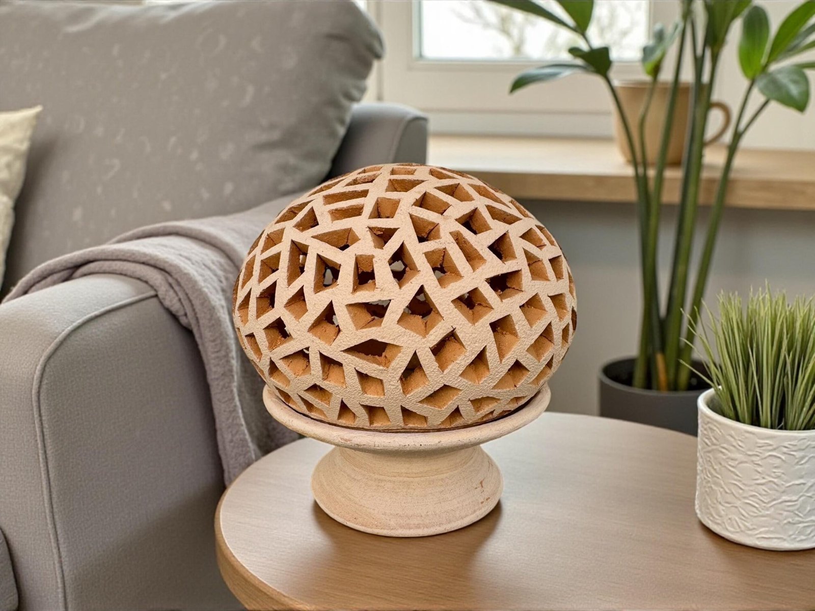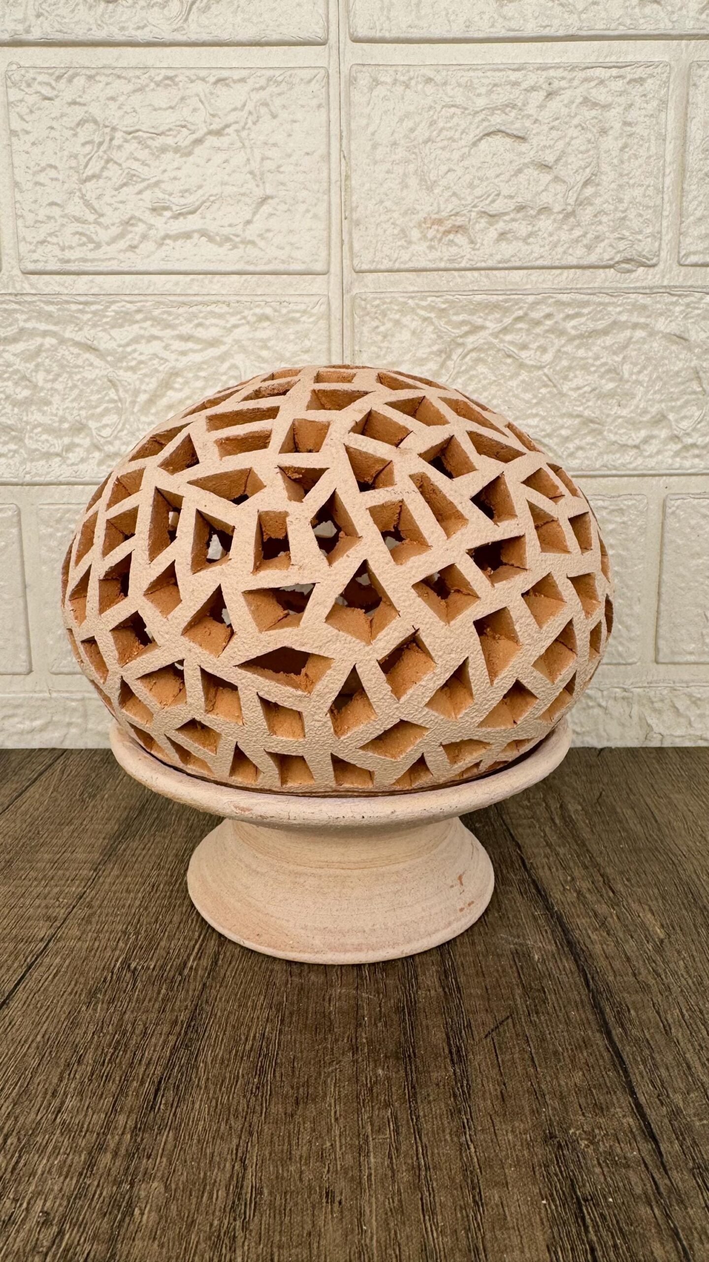 Each piece is sculpted from natural terracotta clay and meticulously carved with geometric cut-out patterns that allow light to softly glow through, creating a cozy and inviting ambiance. Its organic texture and earthy tones make it a beautiful accent for modern, minimalist, boho, or Mexican-inspired interiors.