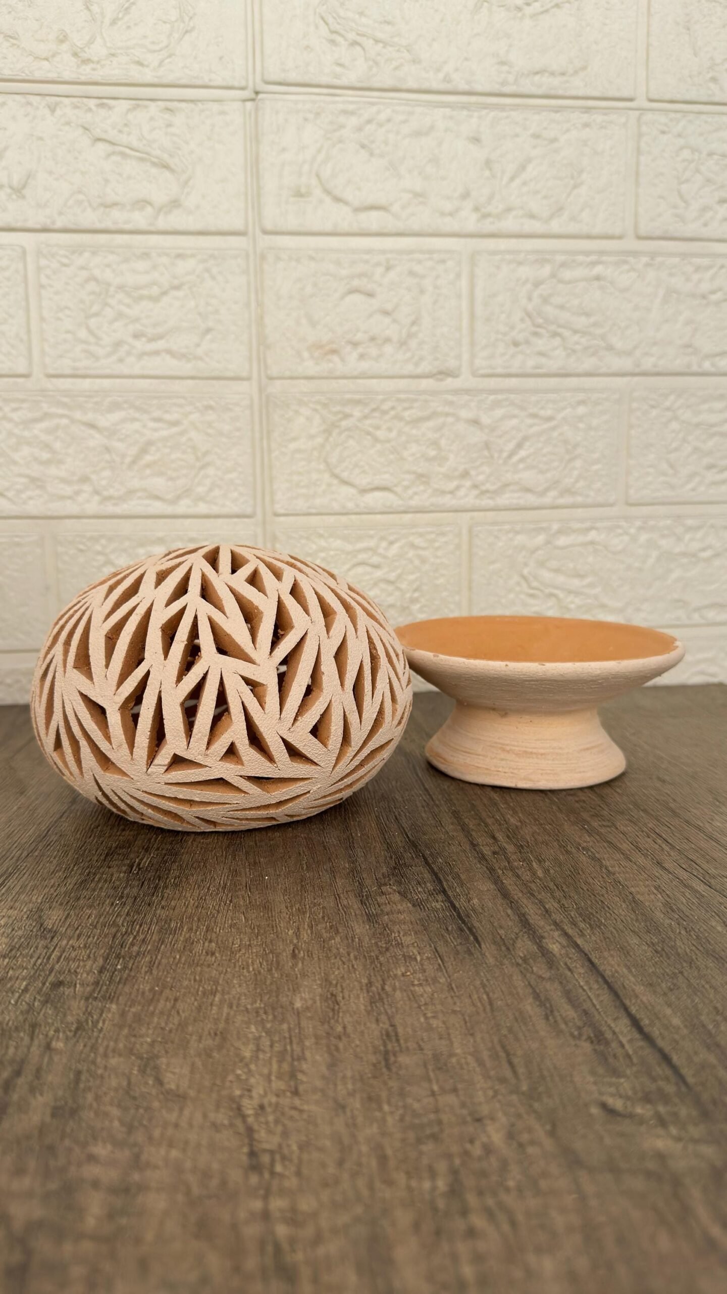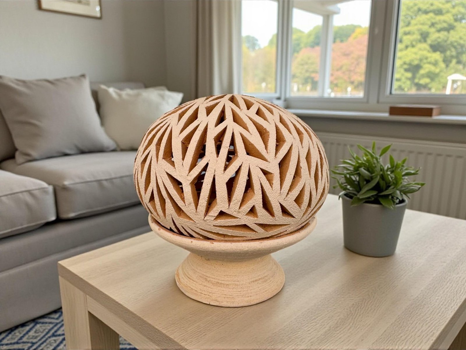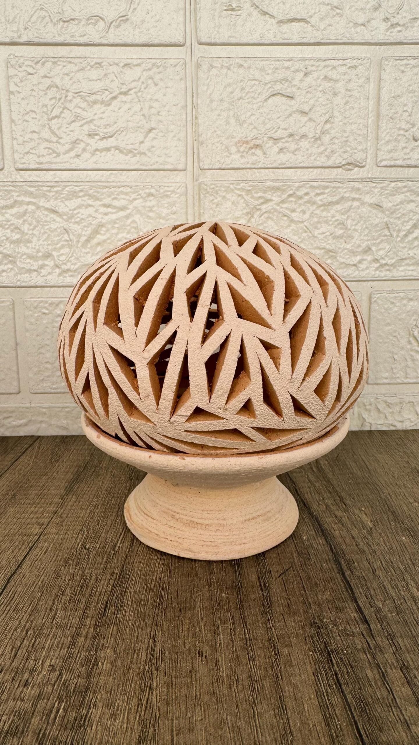 Each piece is sculpted from natural terracotta clay and meticulously carved with geometric cut-out patterns that allow light to softly glow through, creating a cozy and inviting ambiance. Its organic texture and earthy tones make it a beautiful accent for modern, minimalist, boho, or Mexican-inspired interiors.
