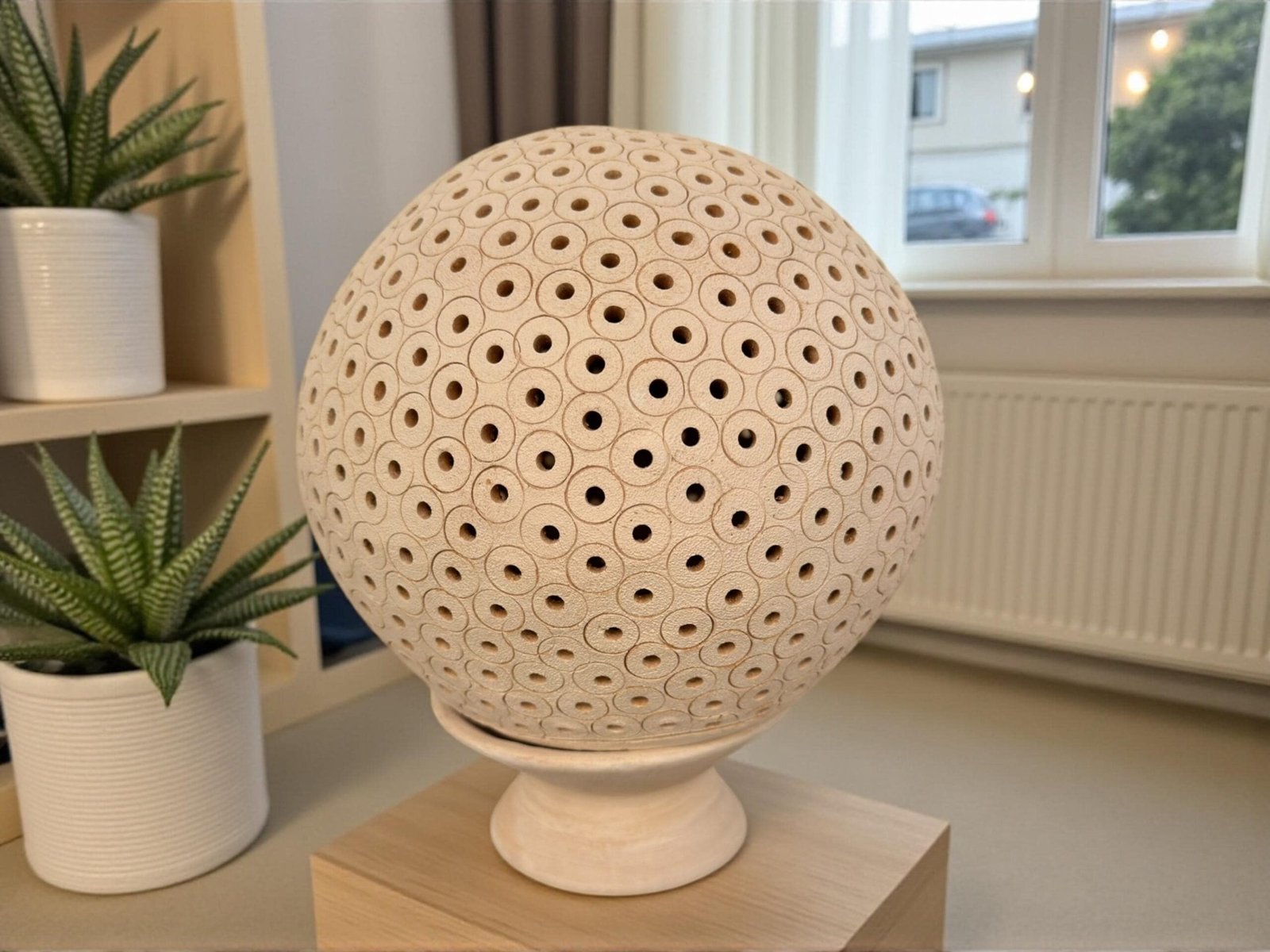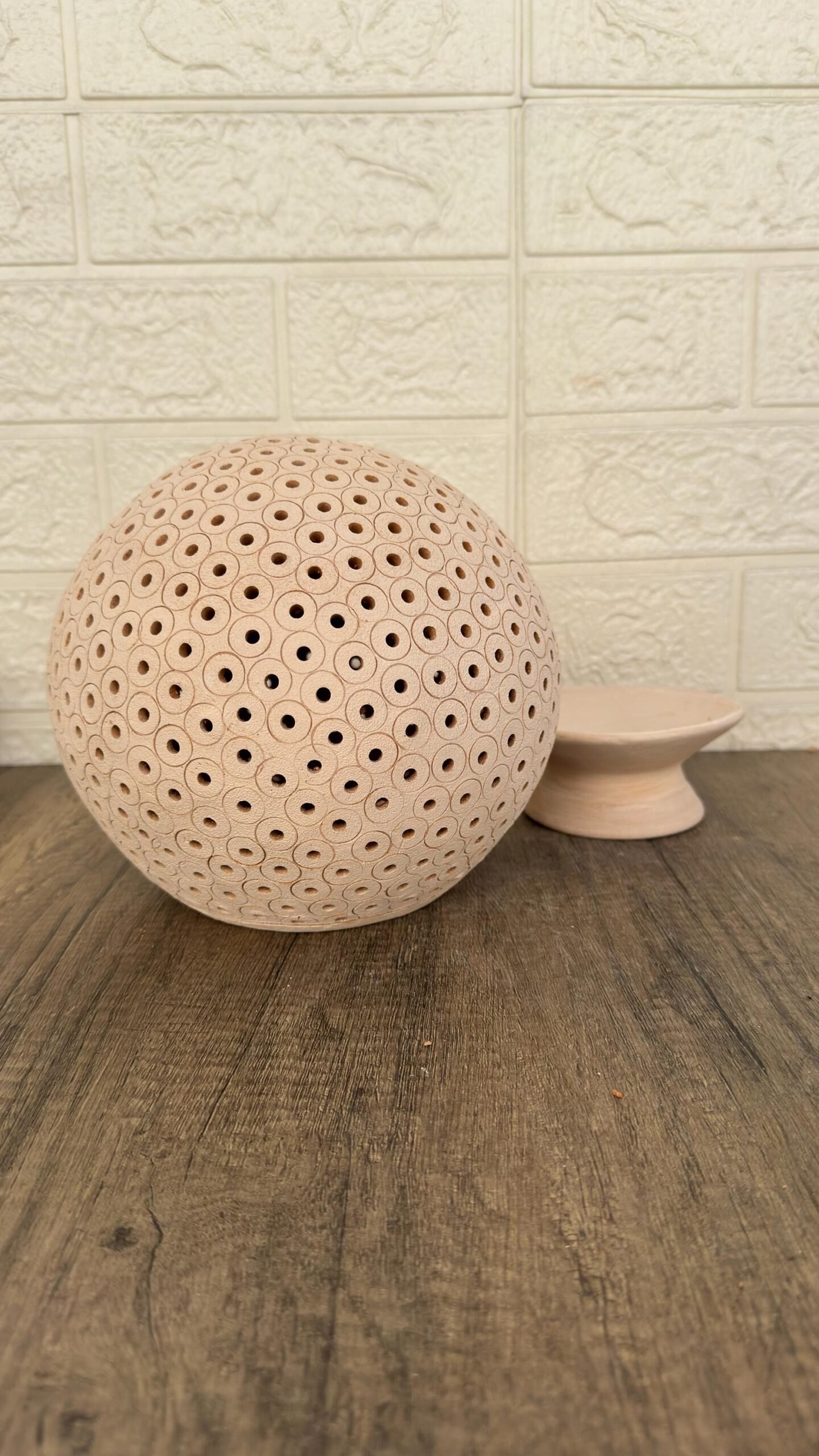 Each piece is sculpted from natural terracotta clay and meticulously carved with geometric cut-out patterns that allow light to softly glow through, creating a cozy and inviting ambiance. Its organic texture and earthy tones make it a beautiful accent for modern, minimalist, boho, or Mexican-inspired interiors.