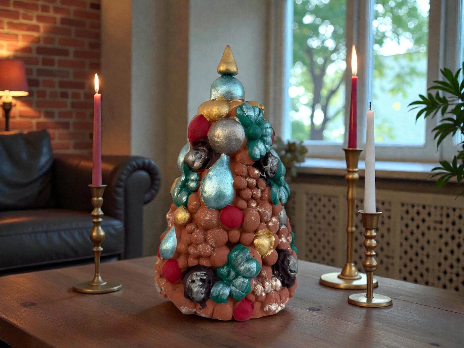 The design features an elegant cone form adorned with raised decorative elements and festive colors, finished with metallic accents that add warmth and character. Its sculptural texture and artisanal charm make it a stunning centerpiece for holiday tables, shelves, or mantels.