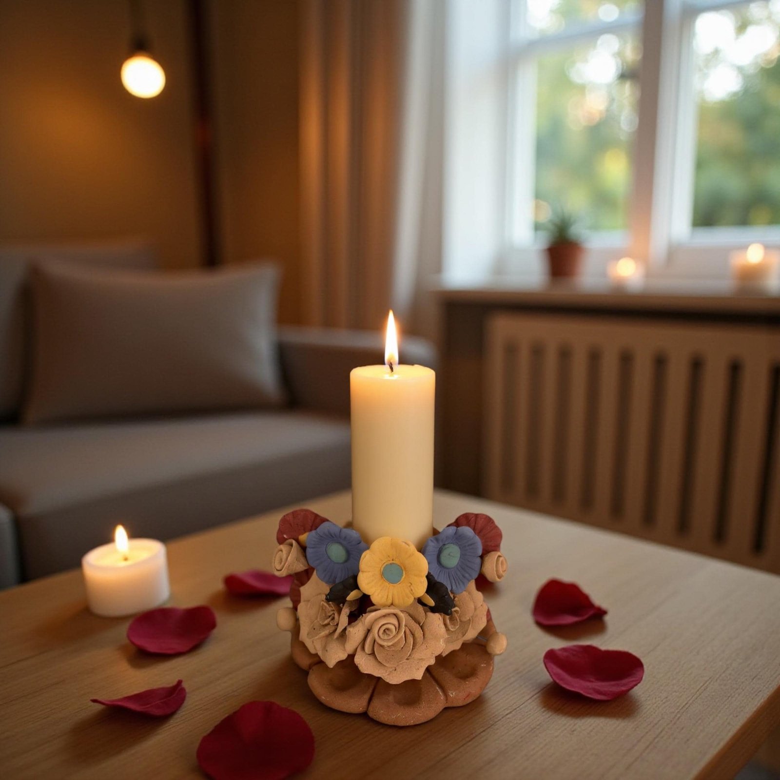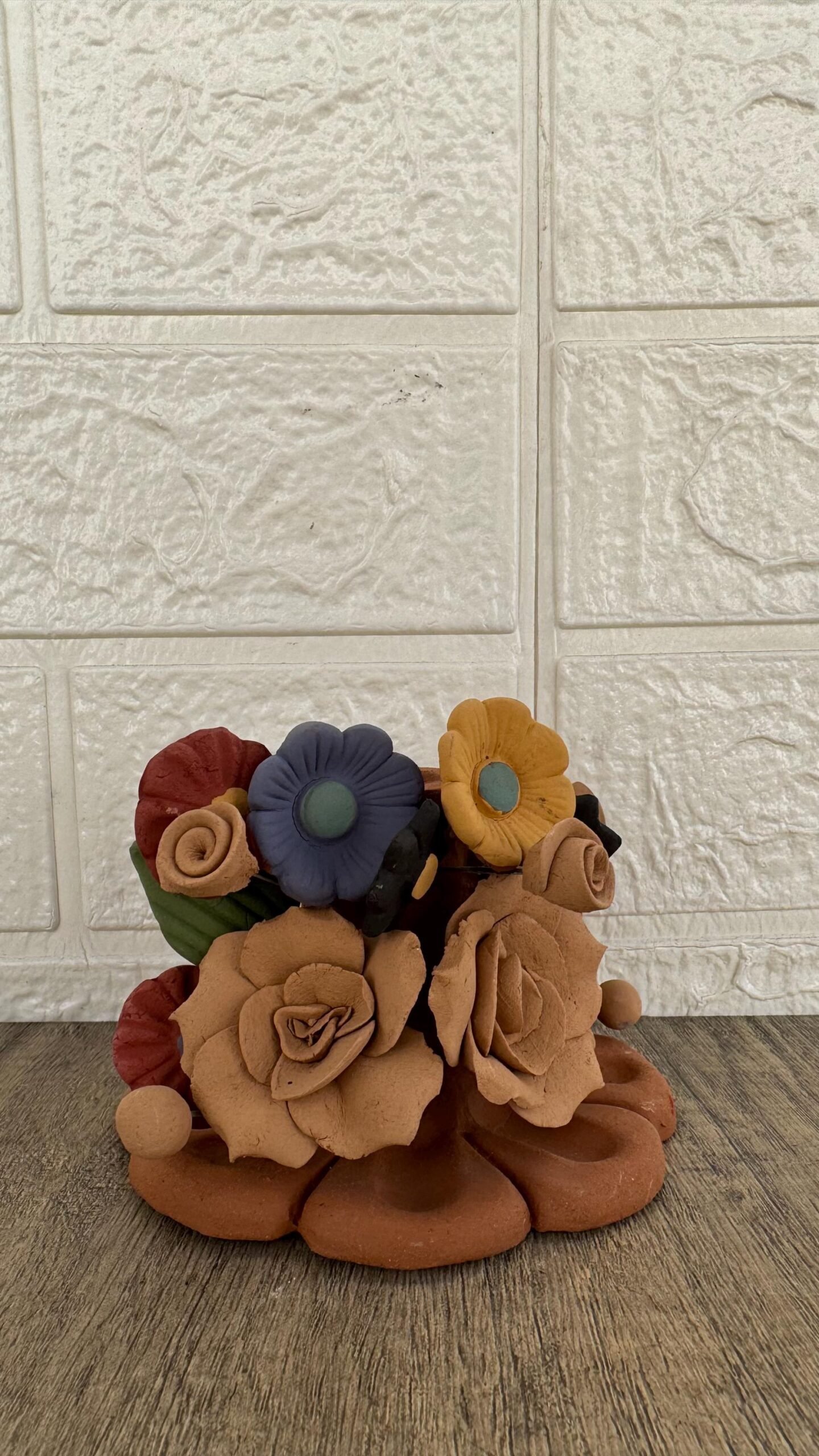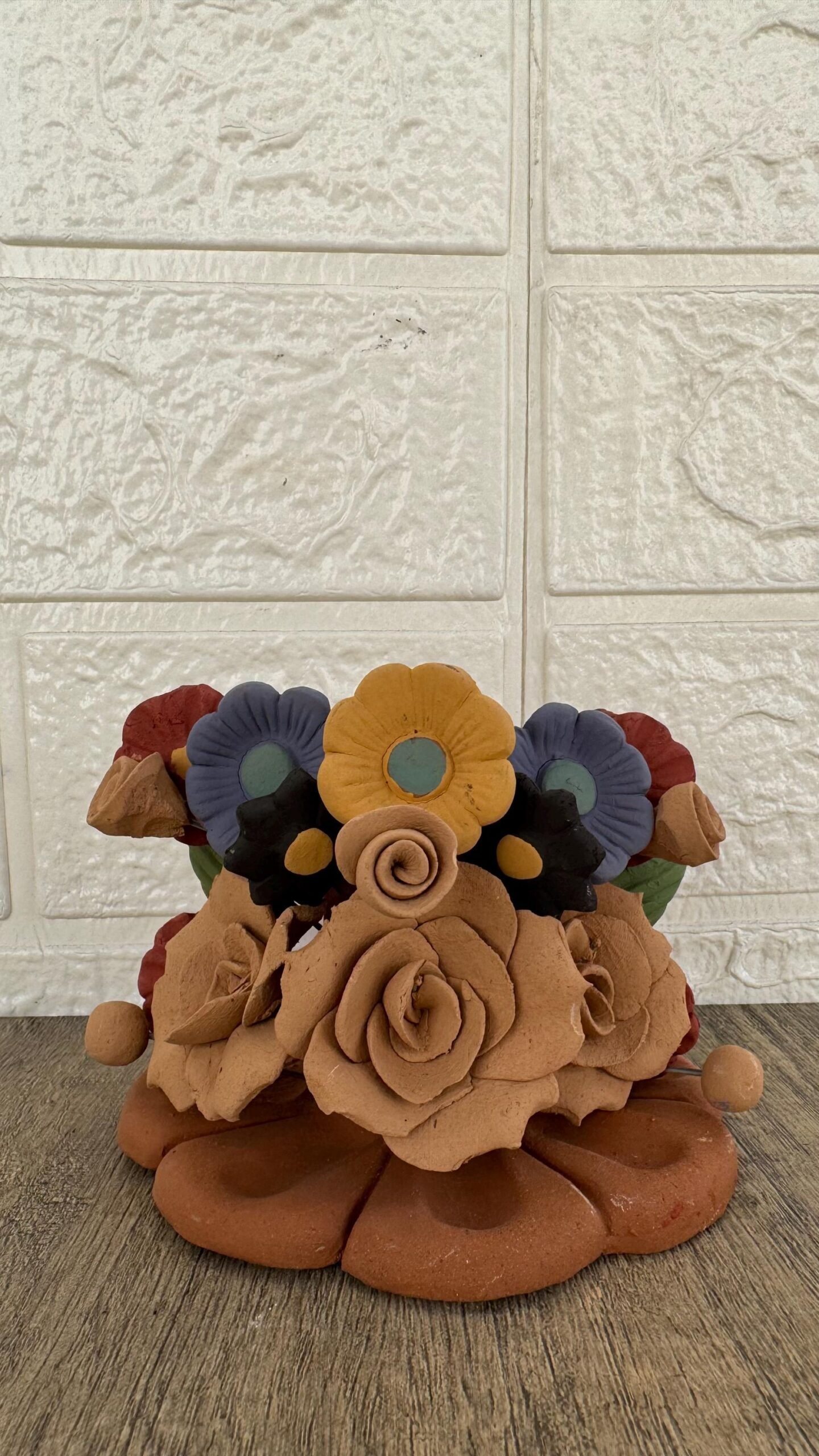 This handcrafted clay candle holder is a stunning example of traditional Oaxacan folk art. Made from natural terracotta, it features an intricate arrangement of hand-sculpted flowers in warm, earthy tones, giving it a rustic yet elegant charm. Each flower is delicately molded and painted by skilled artisans, making every piece one of a kind.