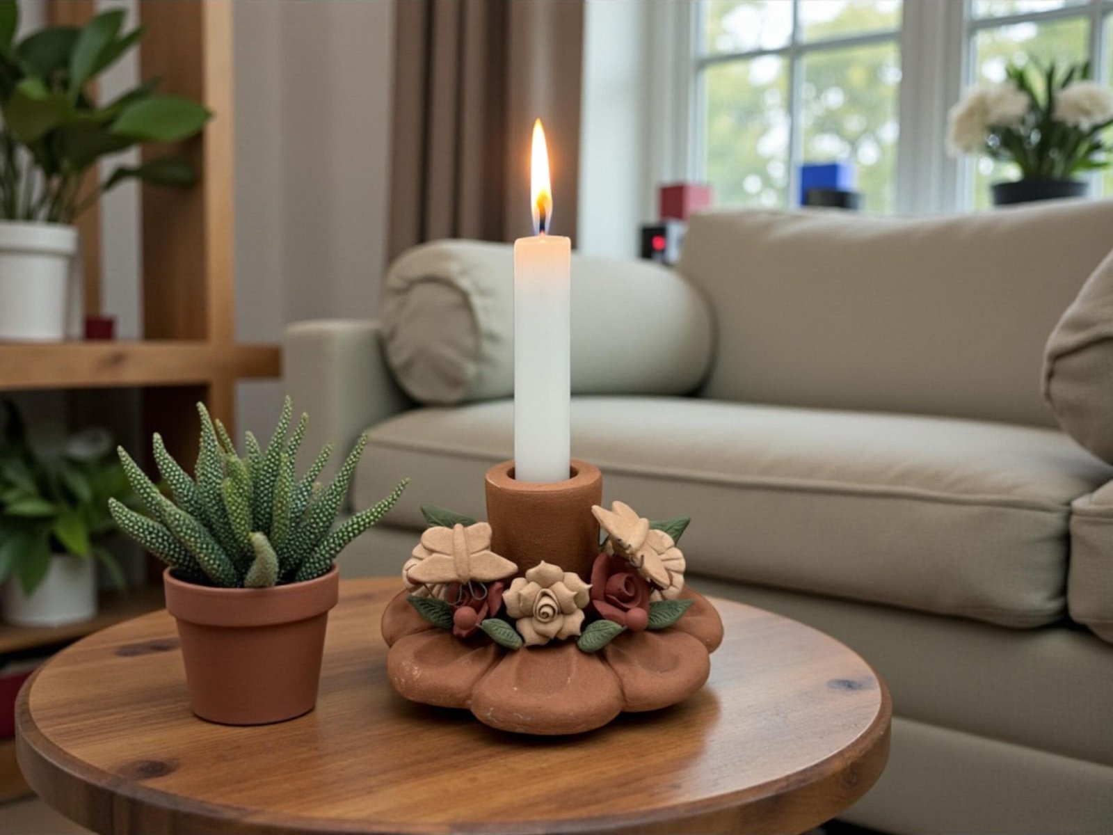 This handcrafted clay candle holder is a stunning example of traditional Oaxacan folk art. Made from natural terracotta, it features an intricate arrangement of hand-sculpted flowers in warm, earthy tones, giving it a rustic yet elegant charm. Each flower is delicately molded and painted by skilled artisans, making every piece one of a kind.