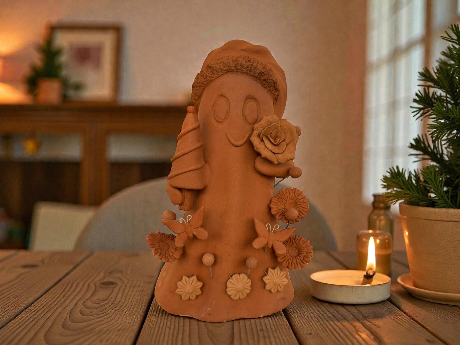 Each piece is carefully molded, sculpted, and painted by hand, incorporating festive elements such as flowers, butterflies, and a tiny Christmas tree — all crafted in clay with meticulous attention to detail. Because it’s fully handcrafted, every ghost is one-of-a-kind, making your piece a meaningful and unique addition to your holiday décor.