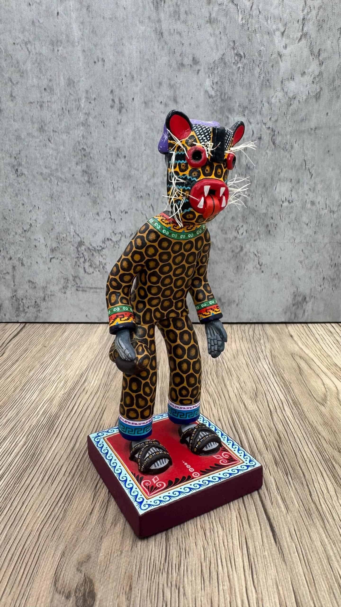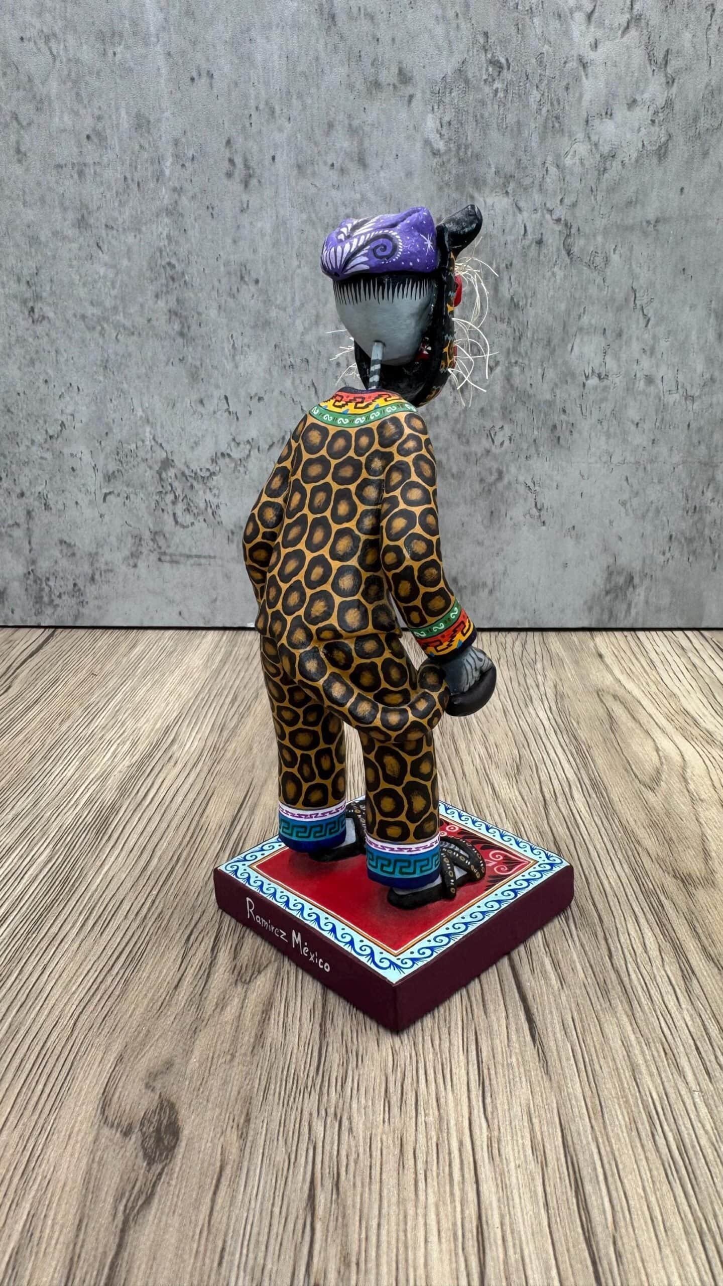This striking handmade Jaguar Dancer sculpture comes from Capula, Michoacán — a region known for its rich ceramic traditions and expressive folk art.