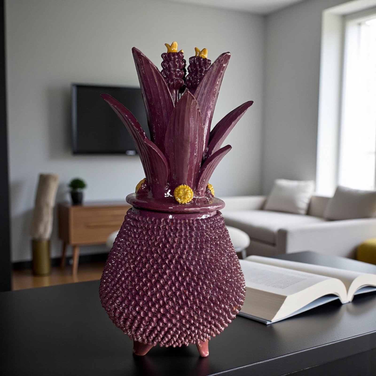 The pineapple sculpture of Michoacan is distinguished in Popular Art in Mexico not only for its quality, but also for the ancestral techniques they use, making a fusion of prehispanic techniques. Glazed clay, named for its glazed, glass-like appearance.