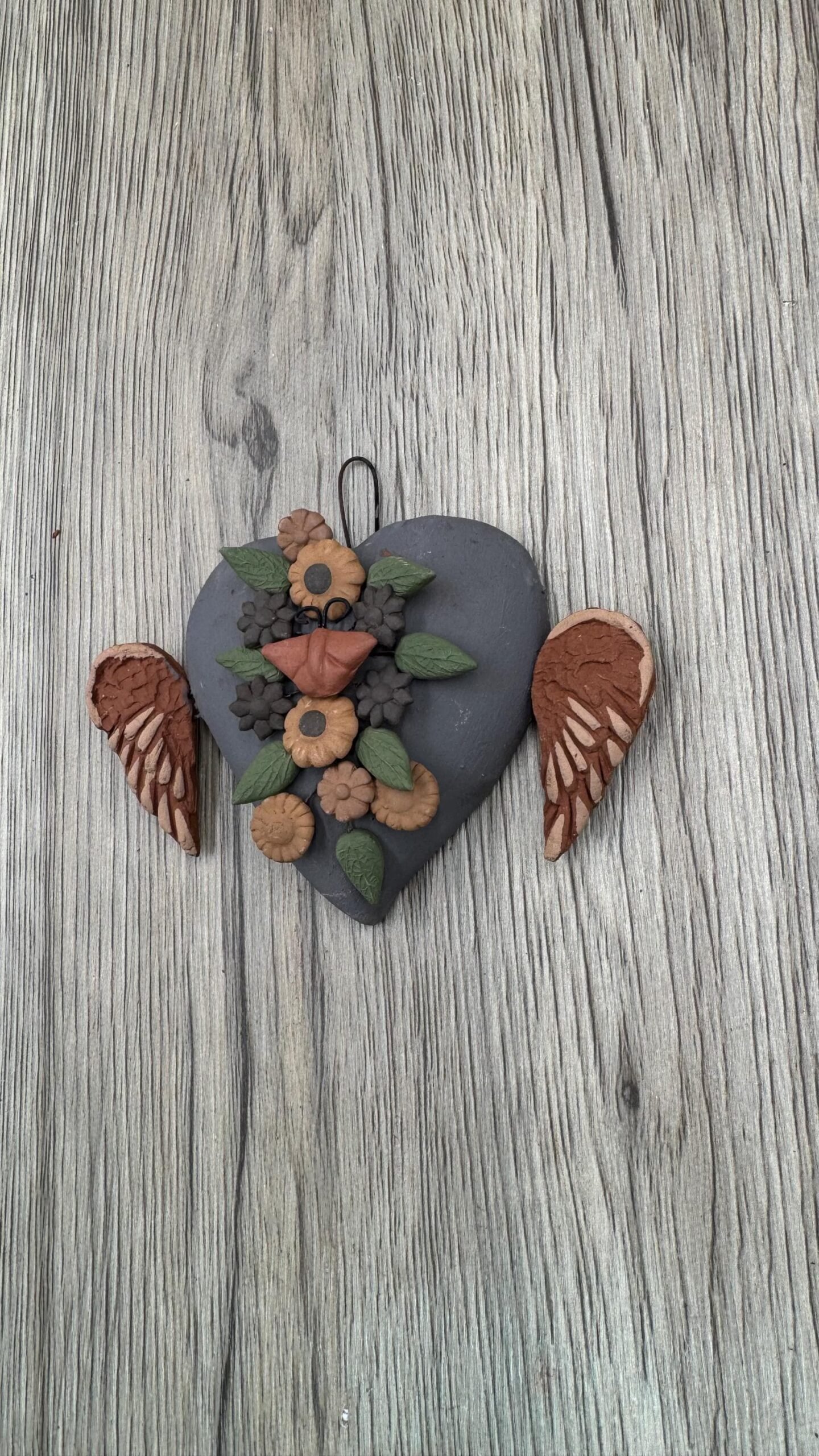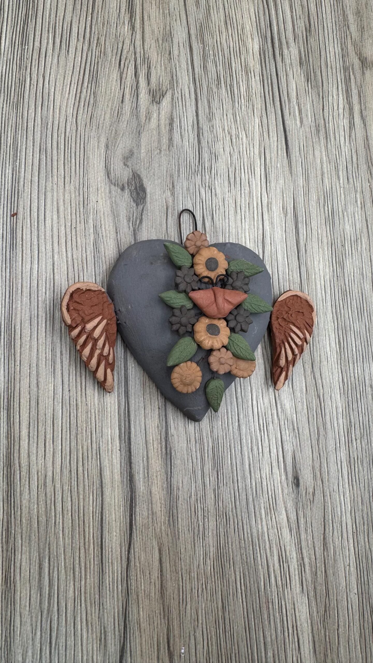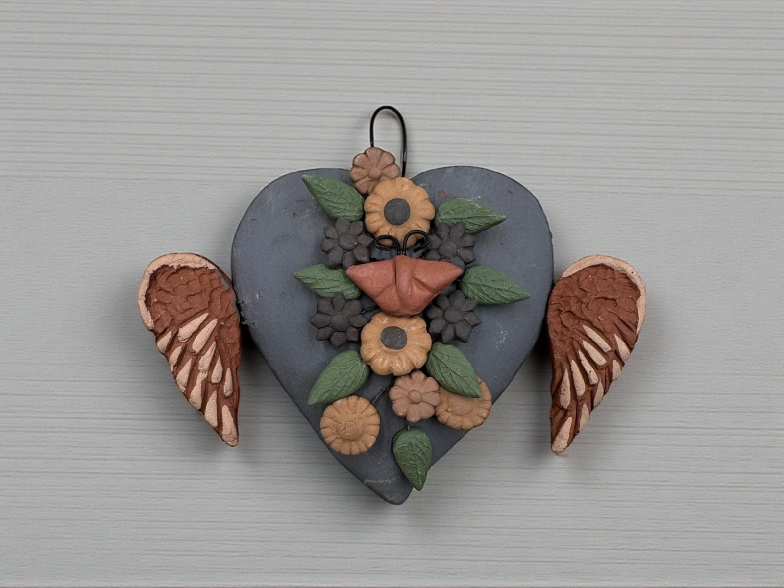 The heart features delicate floral elements sculpted entirely by hand, giving every pendant its own unique character. No molds are used, which means no two pieces are ever exactly alike. The raised details and textured flowers create depth and dimension, making it a meaningful decorative accent for any space.