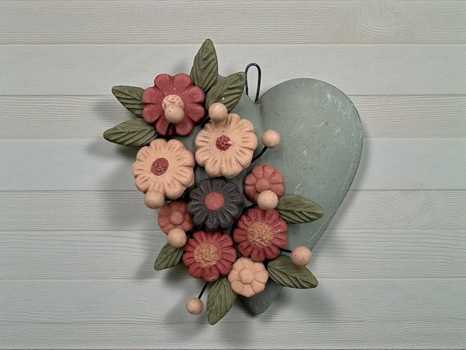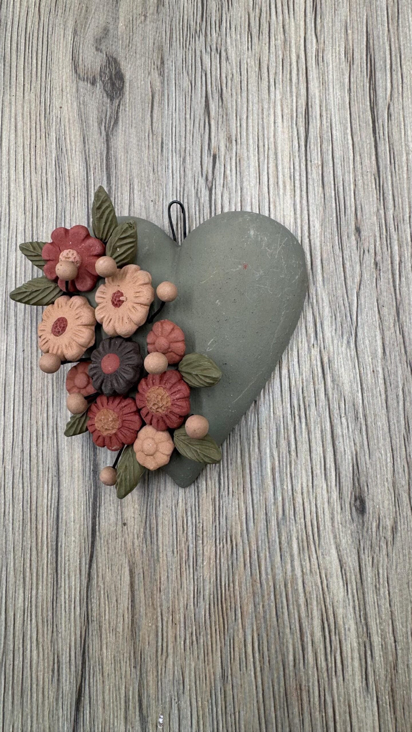 The heart features delicate floral elements sculpted entirely by hand, giving every pendant its own unique character. No molds are used, which means no two pieces are ever exactly alike. The raised details and textured flowers create depth and dimension, making it a meaningful decorative accent for any space.