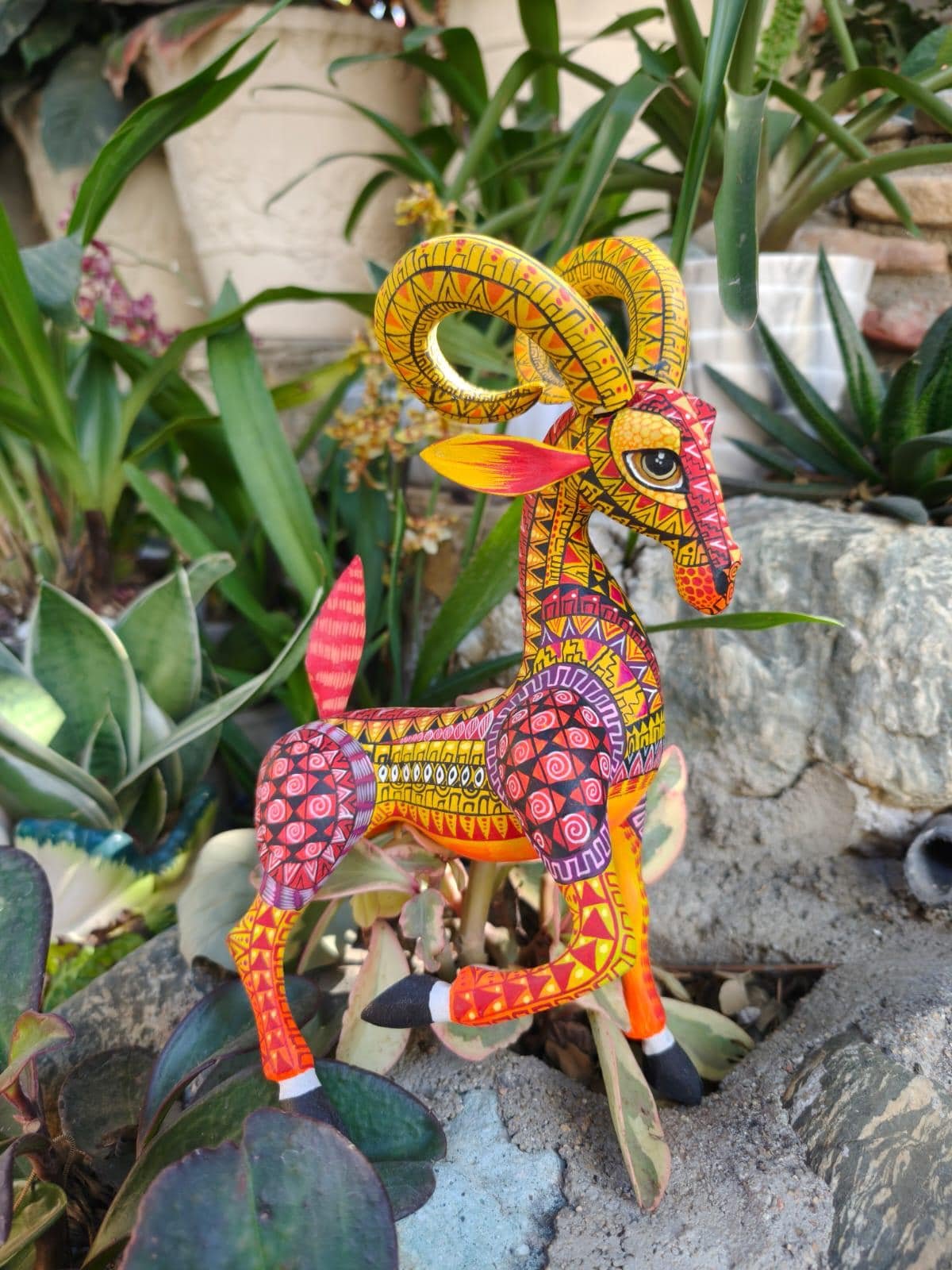 Ram Bighorn Sheep Figurine Mexican Folk Art Alebrije Statue, Wooden Deer As Mexican Decoration Sculpture, Made Of Wood And Carved By Hand