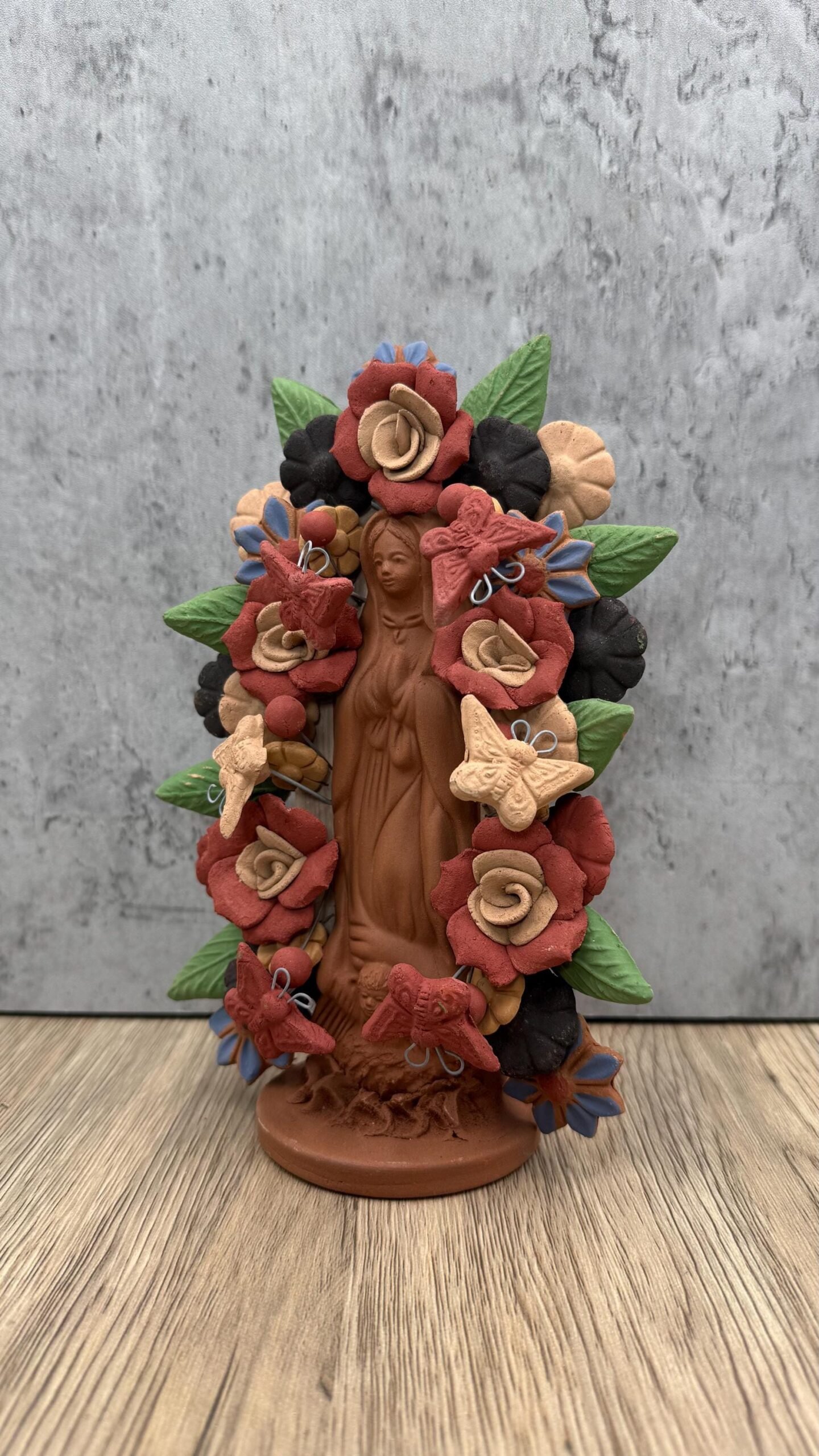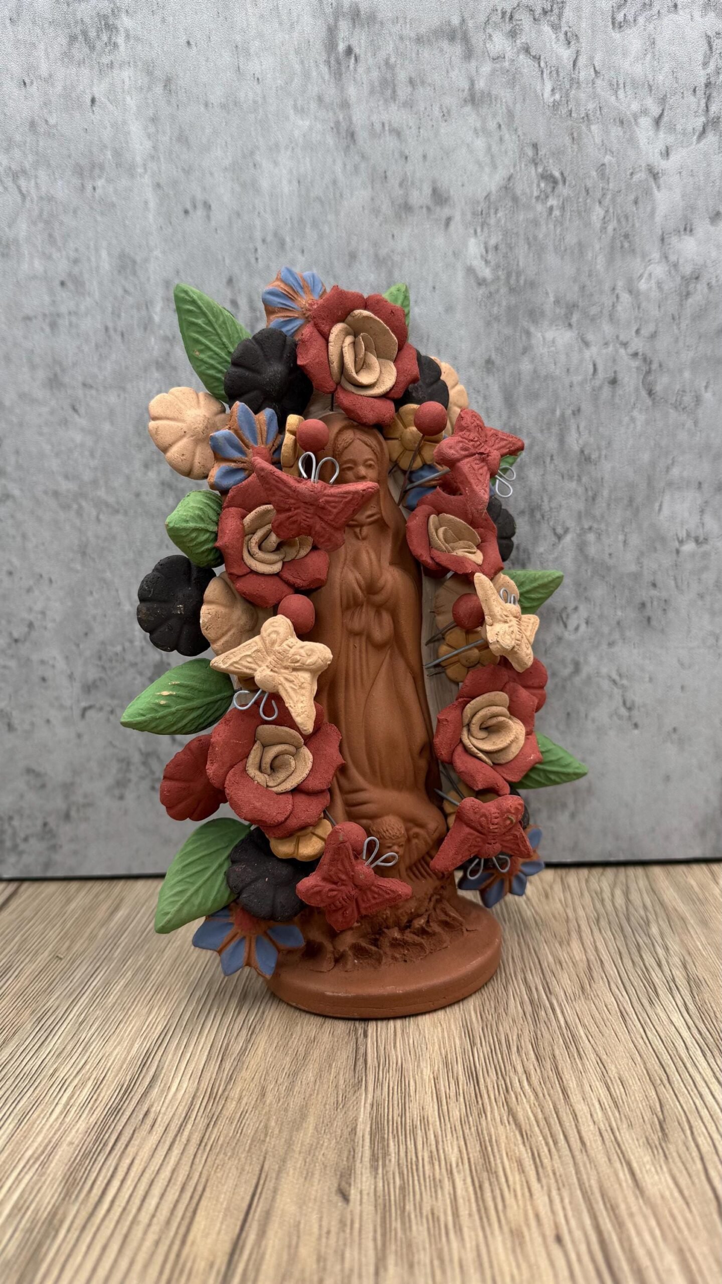 Mary Virgin with flowers decoration ideal to decorate your home or as a special gift, characteristic: – Handmade by Mexican artisans – Polychrome clay material – pigment clay natural colors – Dimentions 9” Tall This handcrafted clay Virgin is a stunning representation of Mexican folk art, lovingly made by talented artisans in Metepec, Estado de México. Famous for its barro (clay) traditions, Metepec is a vibrant town where cultural heritage and craftsmanship are deeply rooted in every piece. Each Virgin is carefully shaped and painted by hand, featuring intricate details and warm earthy tones that reflect the spiritual and artistic essence of the region. This beautiful figure brings a sacred, heartfelt presence to any home, altar, or devotional space. It’s not just a decoration—it’s a meaningful connection to tradition, faith, and the hands that created it. Every piece is unique, with slight variations in color and expression, adding to its authenticity and charm. Perfect as a gift or a treasured part of your own spiritual collection.