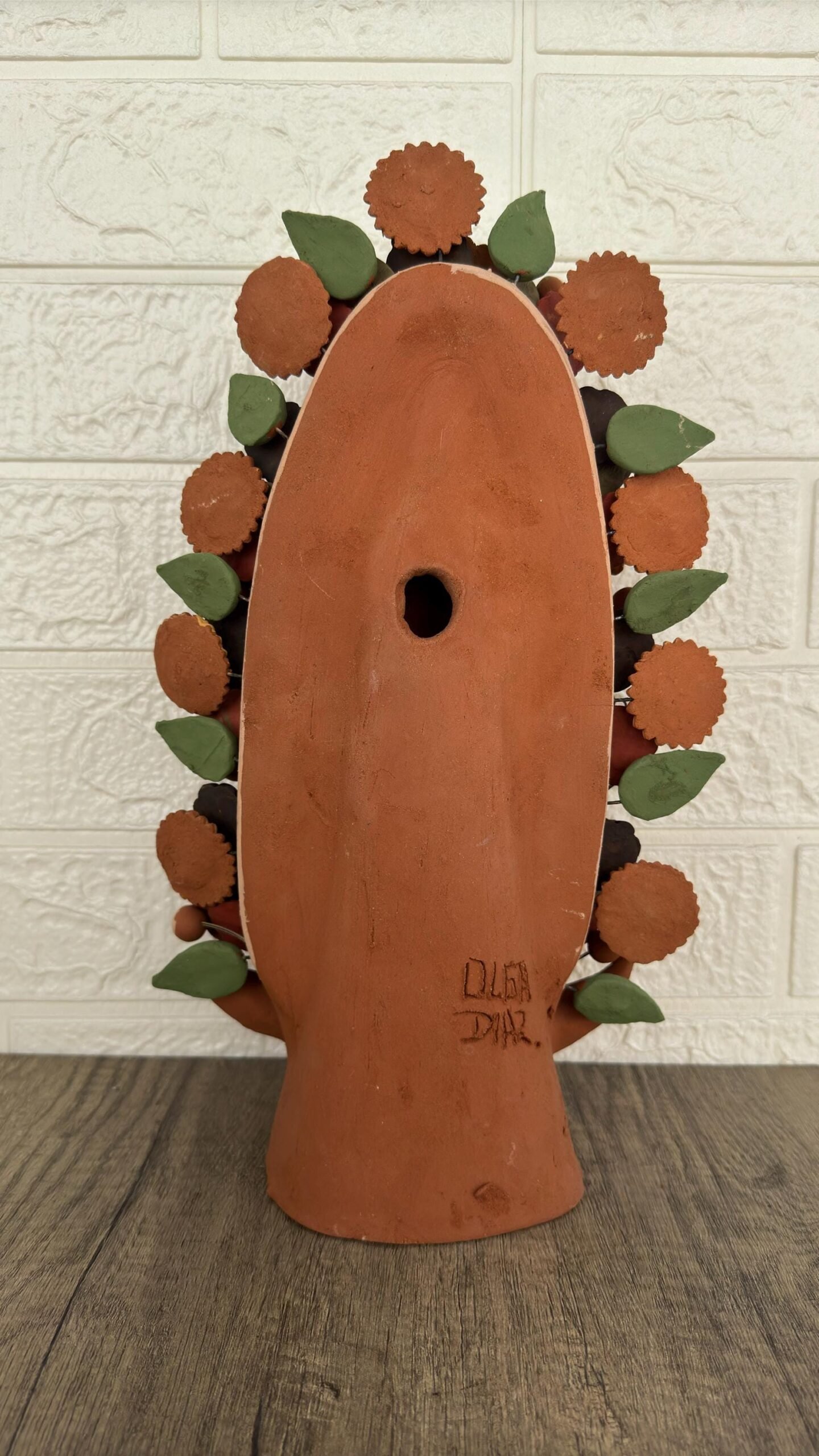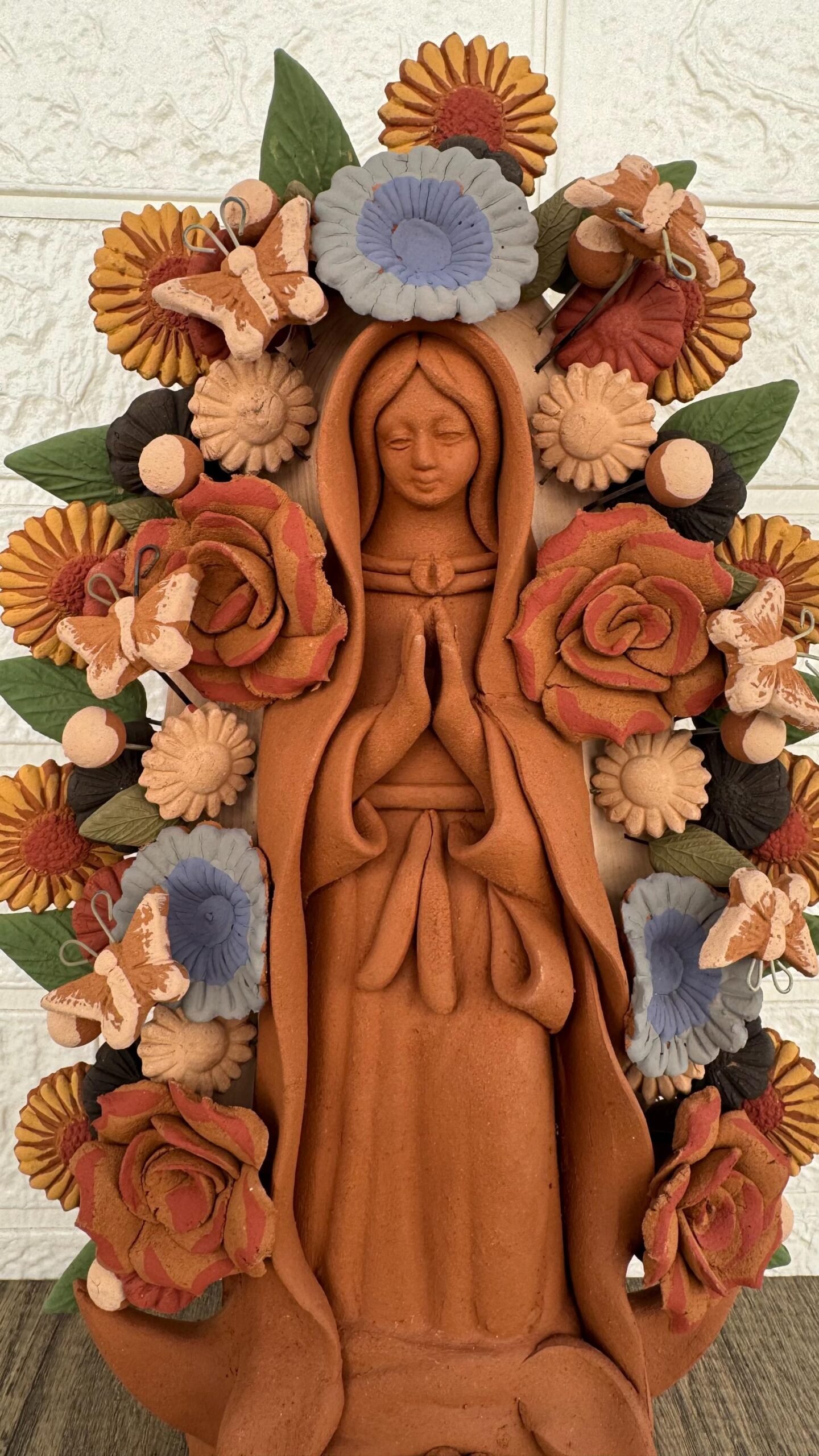 This handcrafted clay Virgin is a stunning representation of Mexican folk art, lovingly made by talented artisans in Metepec, Estado de México. Famous for its barro (clay) traditions, Metepec is a vibrant town where cultural heritage and craftsmanship are deeply rooted in every piece. Each Virgin is carefully shaped and painted by hand, featuring intricate details and warm earthy tones that reflect the spiritual and artistic essence of the region.