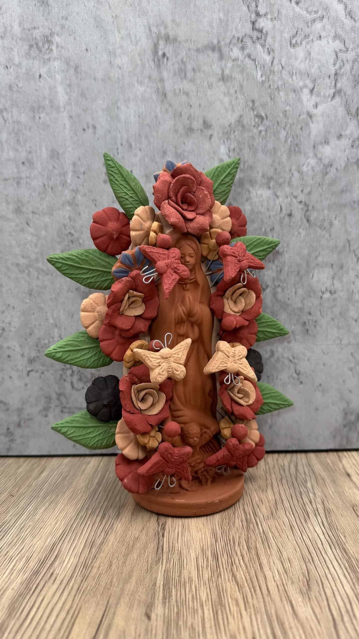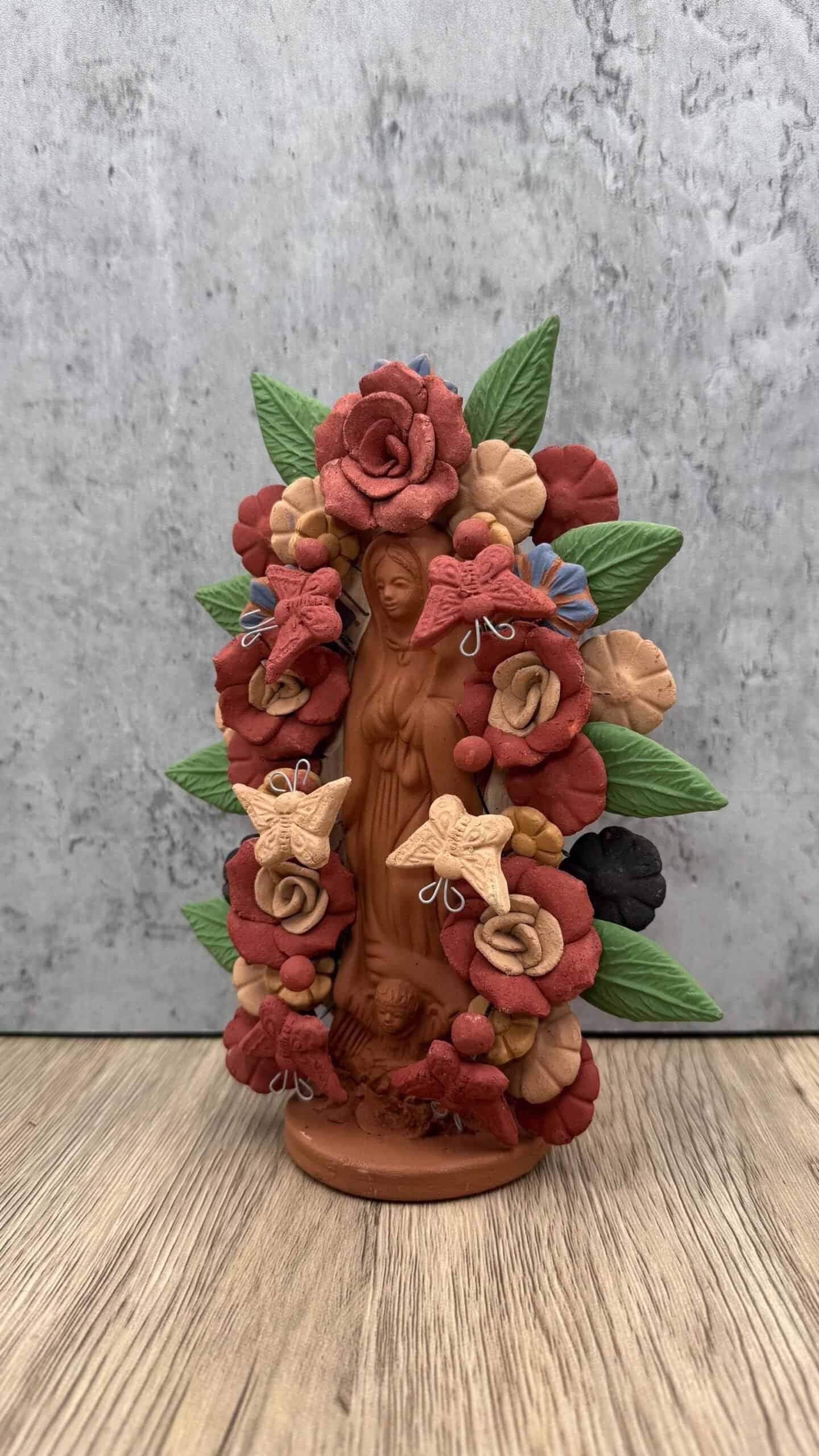 This handcrafted clay Virgin is a stunning representation of Mexican folk art, lovingly made by talented artisans in Metepec, Estado de México. Famous for its barro (clay) traditions, Metepec is a vibrant town where cultural heritage and craftsmanship are deeply rooted in every piece. Each Virgin is carefully shaped and painted by hand, featuring intricate details and warm earthy tones that reflect the spiritual and artistic essence of the region.