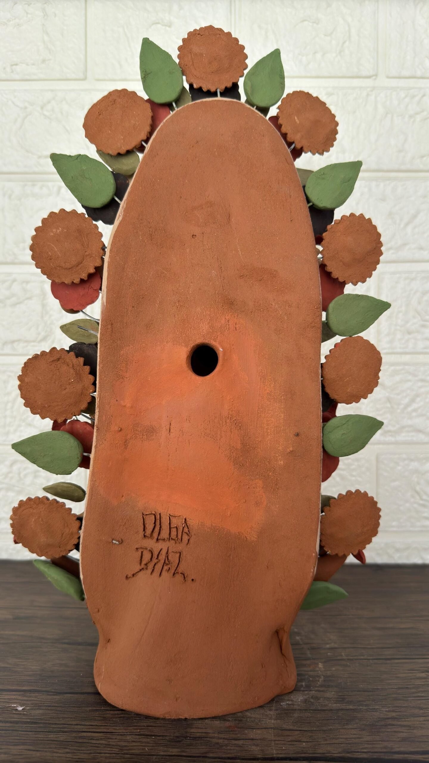 This handcrafted clay Virgin is a stunning representation of Mexican folk art, lovingly made by talented artisans in Metepec, Estado de México. Famous for its barro (clay) traditions, Metepec is a vibrant town where cultural heritage and craftsmanship are deeply rooted in every piece. Each Virgin is carefully shaped and painted by hand, featuring intricate details and warm earthy tones that reflect the spiritual and artistic essence of the region.