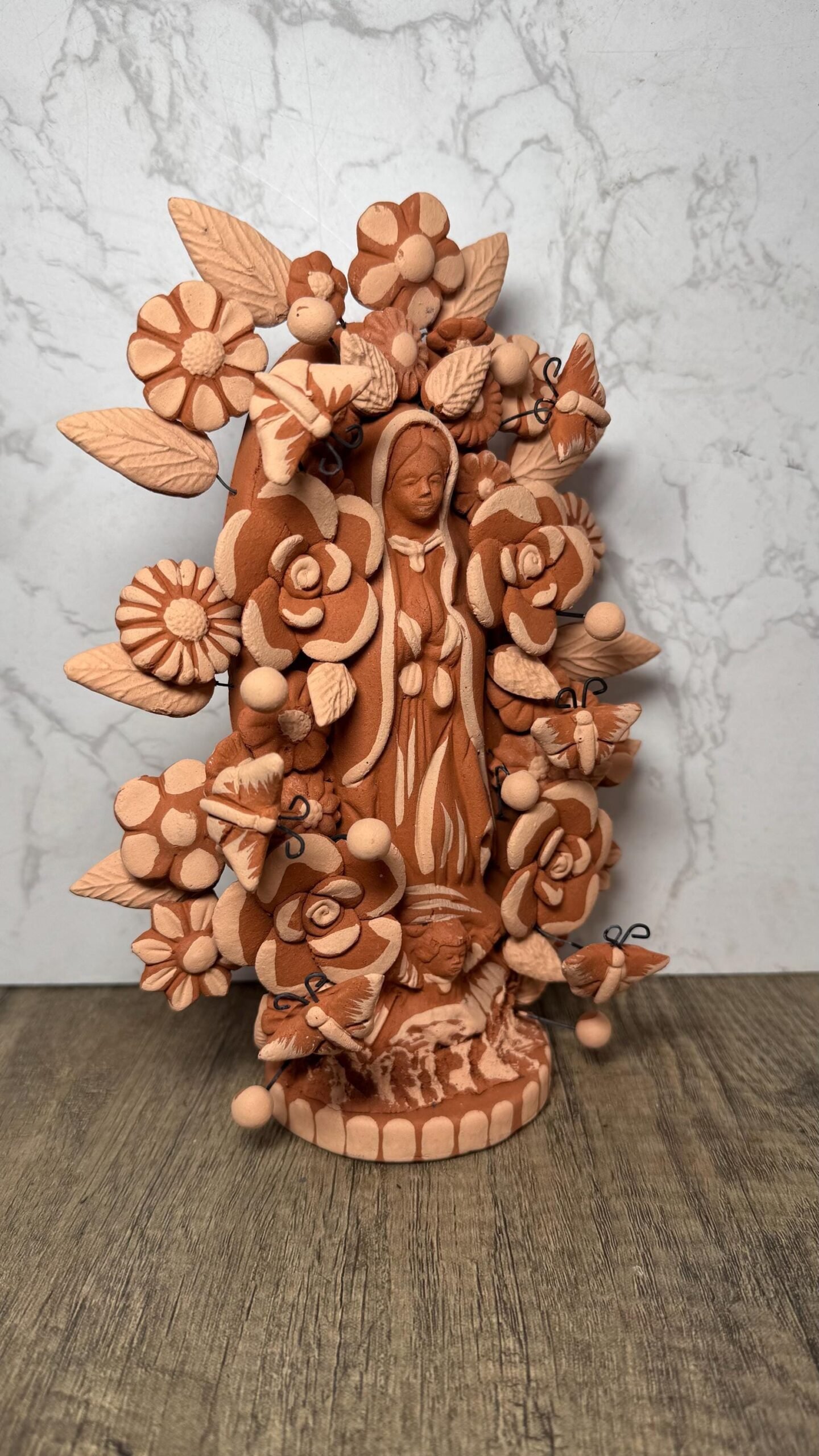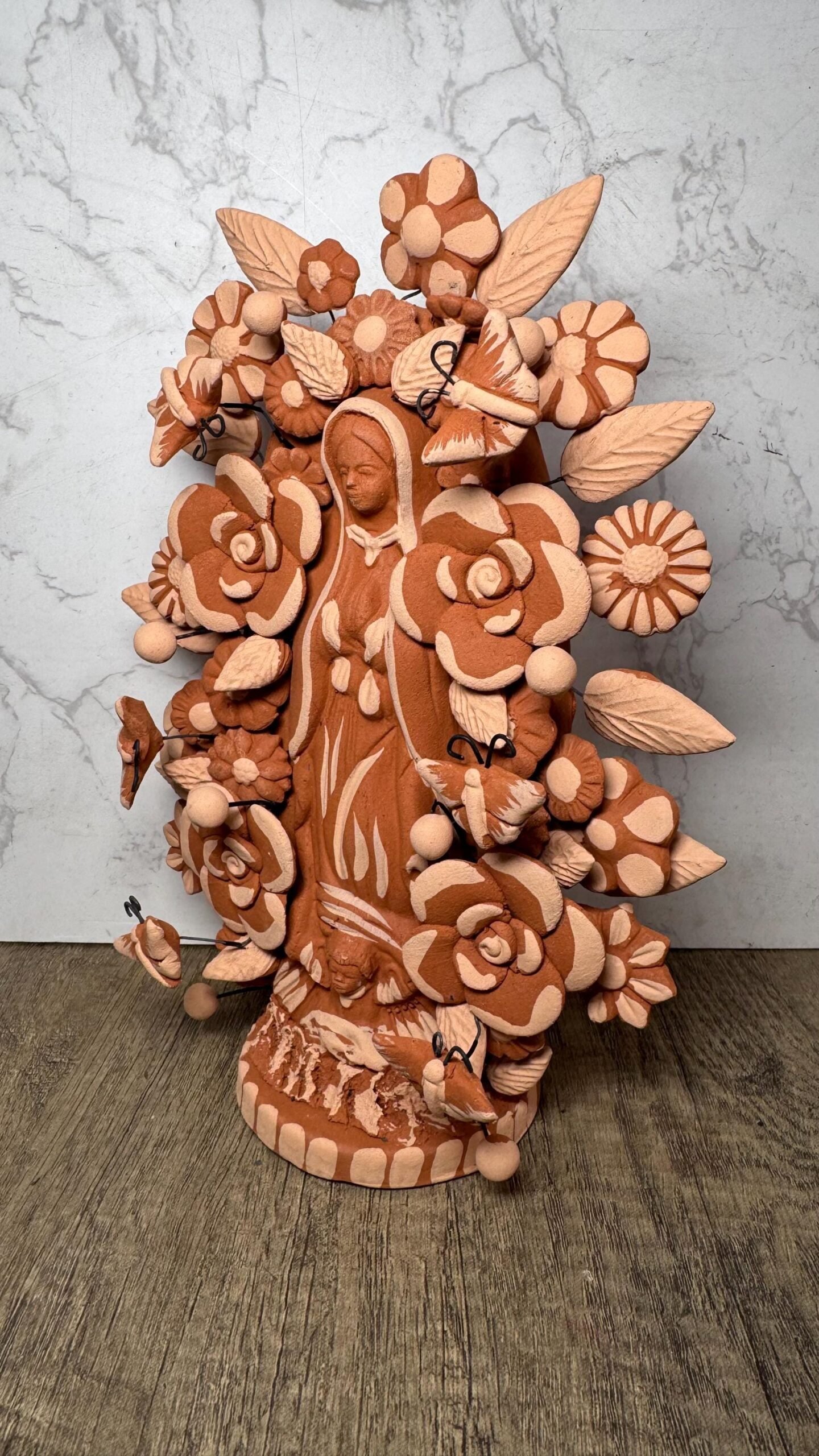 Mary Virgin with flowers decoration ideal to decorate your home or as a special gift, characteristic: – Handmade by Mexican artisans – Polychrome clay material – pigment clay natural colors – Dimentions 9” Tall This handcrafted clay Virgin is a stunning representation of Mexican folk art, lovingly made by talented artisans in Metepec, Estado de México. Famous for its barro (clay) traditions, Metepec is a vibrant town where cultural heritage and craftsmanship are deeply rooted in every piece. Each Virgin is carefully shaped and painted by hand, featuring intricate details and warm earthy tones that reflect the spiritual and artistic essence of the region. This beautiful figure brings a sacred, heartfelt presence to any home, altar, or devotional space. It’s not just a decoration—it’s a meaningful connection to tradition, faith, and the hands that created it. Every piece is unique, with slight variations in color and expression, adding to its authenticity and charm. Perfect as a gift or a treasured part of your own spiritual collection.