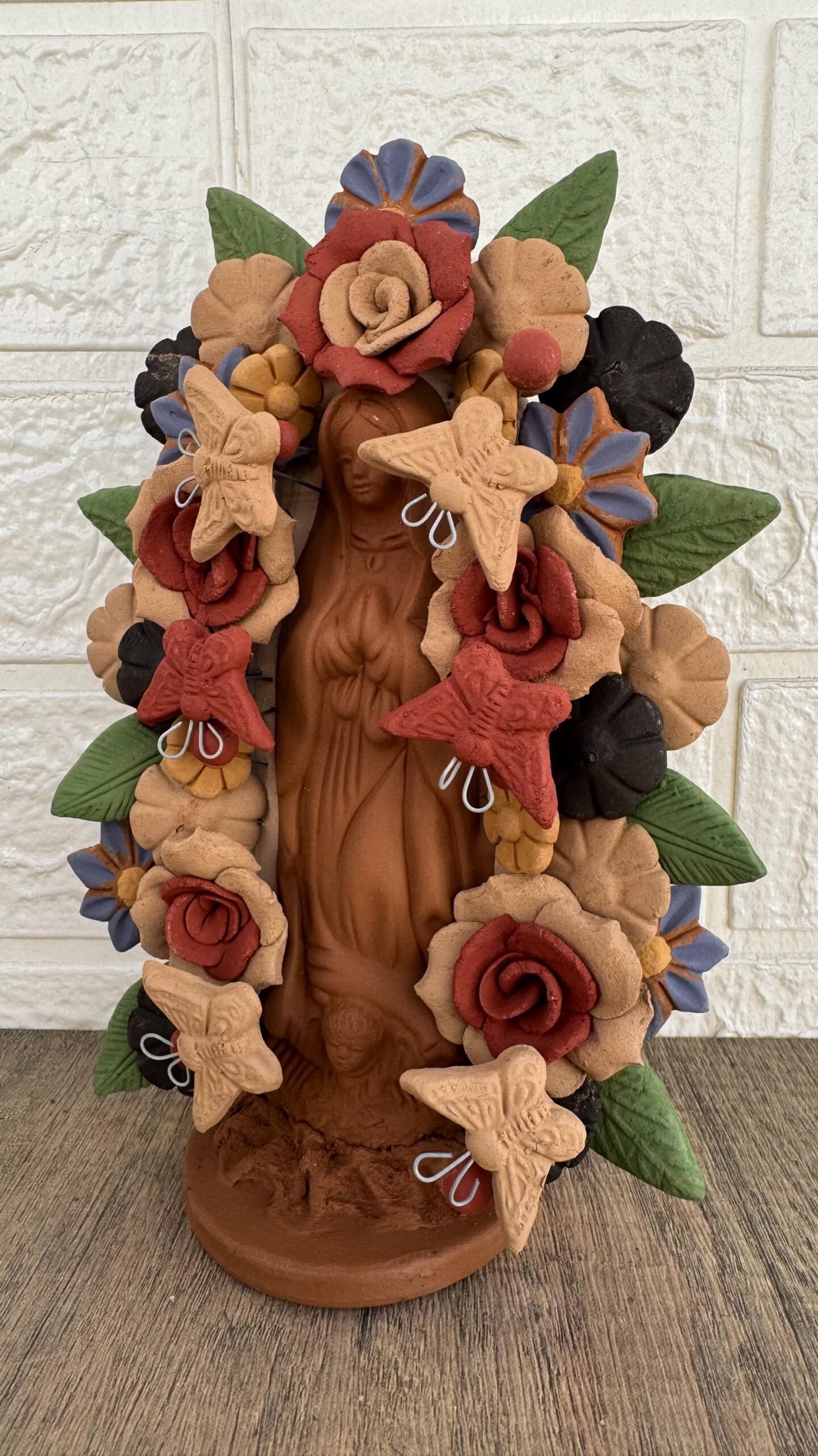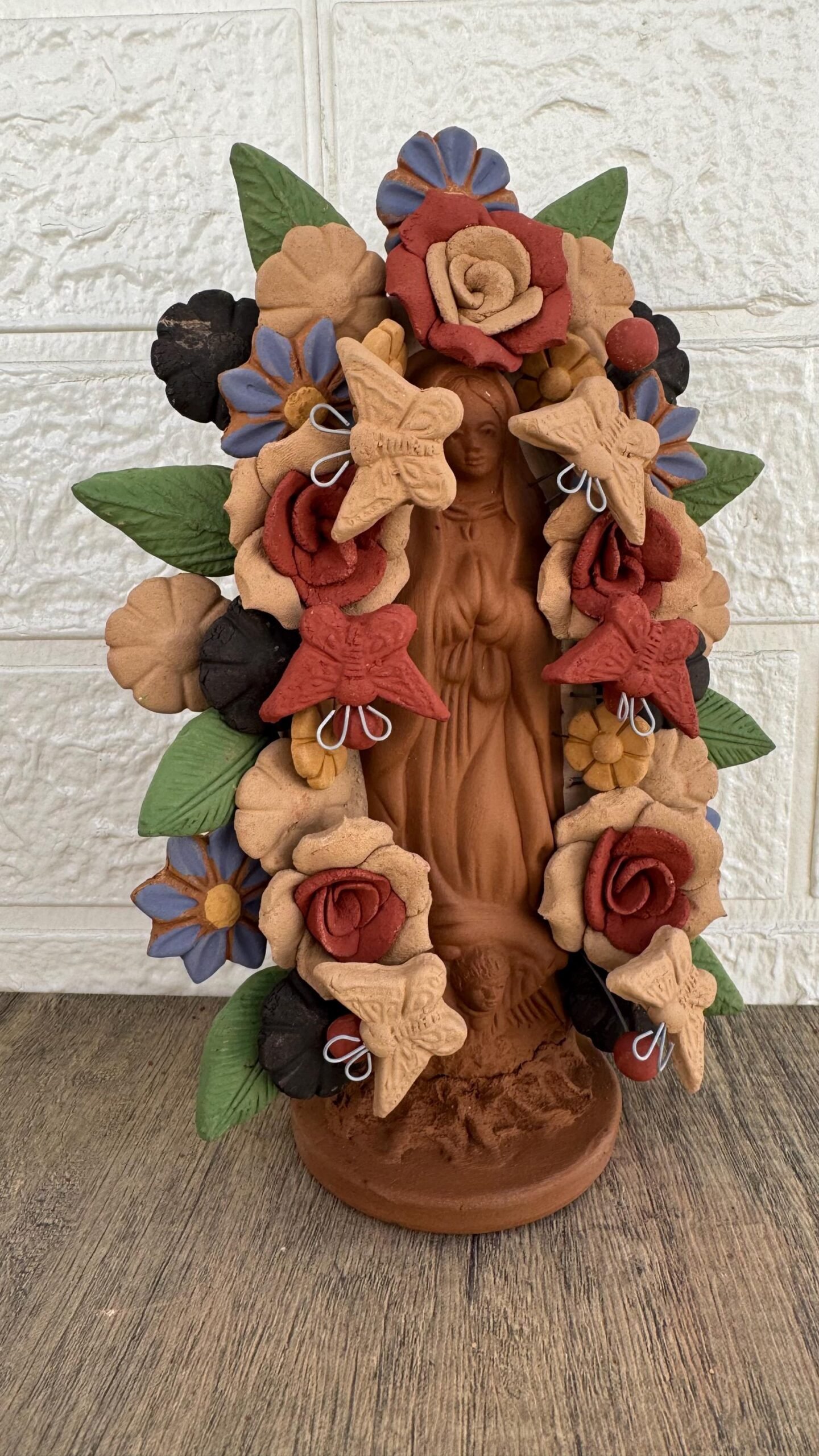 This handcrafted clay Virgin is a stunning representation of Mexican folk art, lovingly made by talented artisans in Metepec, Estado de México. Famous for its barro (clay) traditions, Metepec is a vibrant town where cultural heritage and craftsmanship are deeply rooted in every piece. Each Virgin is carefully shaped and painted by hand, featuring intricate details and warm earthy tones that reflect the spiritual and artistic essence of the region.
