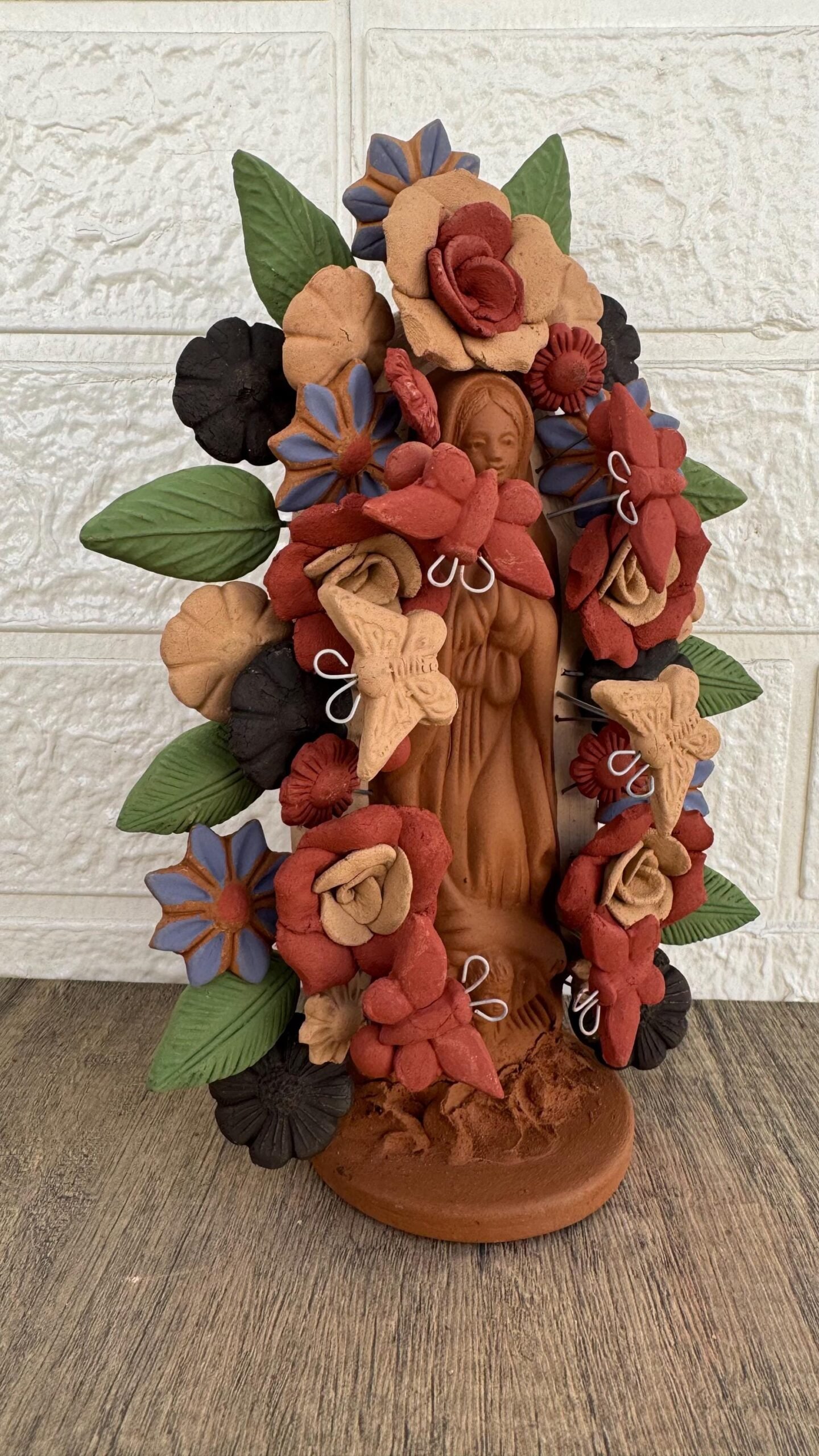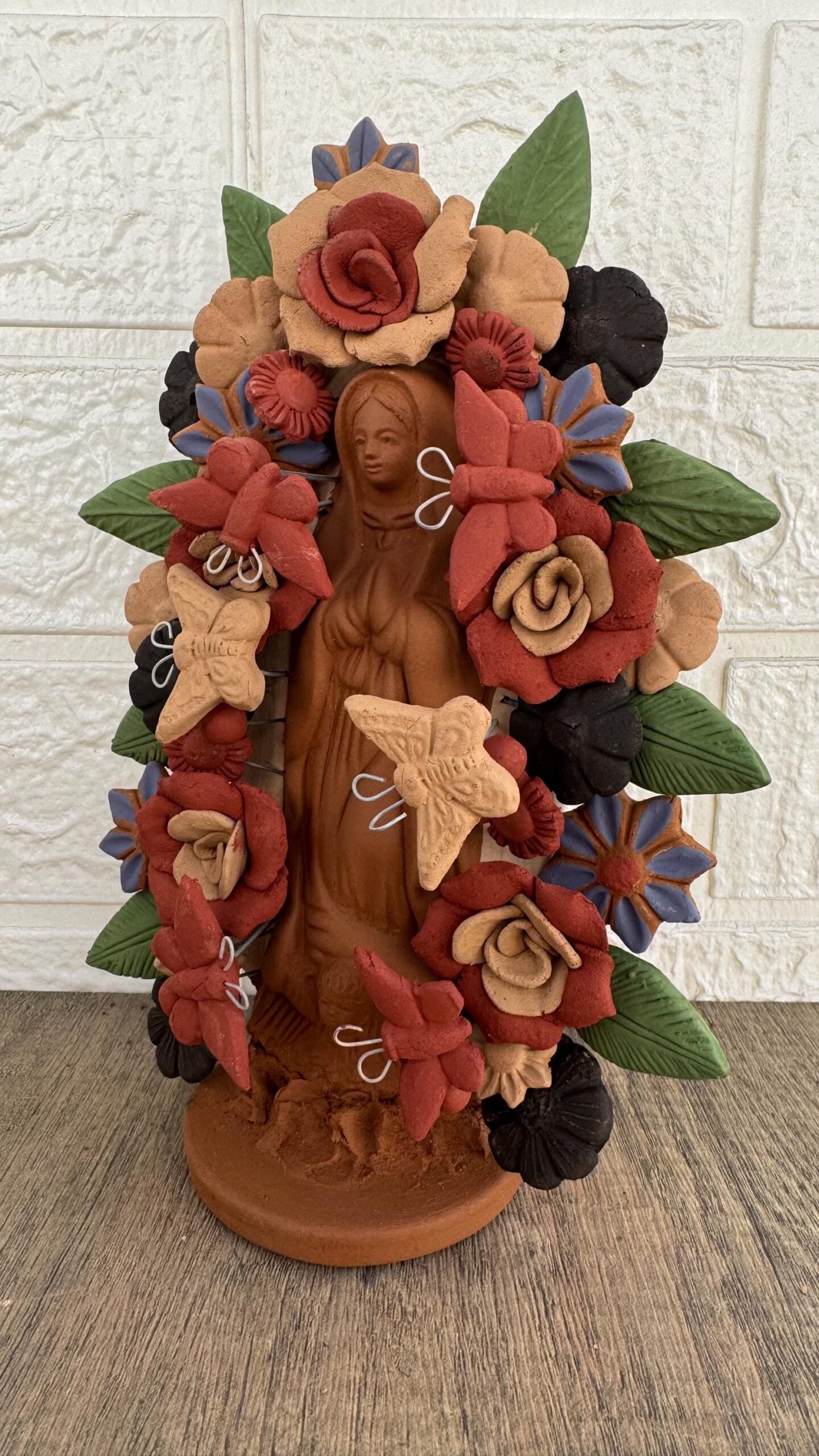 This handcrafted clay Virgin is a stunning representation of Mexican folk art, lovingly made by talented artisans in Metepec, Estado de México. Famous for its barro (clay) traditions, Metepec is a vibrant town where cultural heritage and craftsmanship are deeply rooted in every piece. Each Virgin is carefully shaped and painted by hand, featuring intricate details and warm earthy tones that reflect the spiritual and artistic essence of the region.