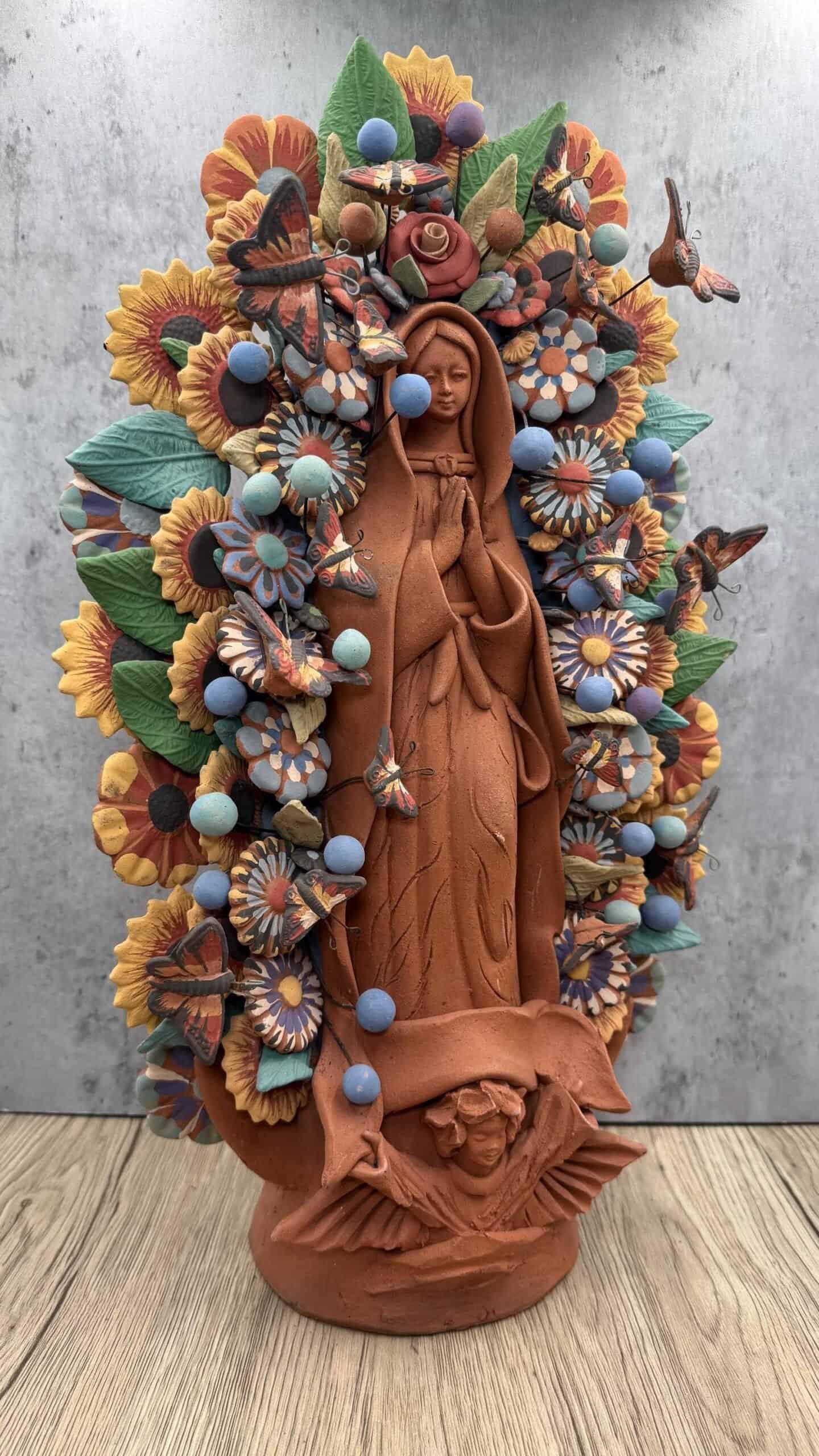 Mary Virgin with flowers decoration ideal to decorate your home or as a special gift, characteristic: – Handmade by Mexican artisans – clay material – clay natural colors – Dimentions 20” Tall This handcrafted clay Virgin is a stunning representation of Mexican folk art, lovingly made by talented artisans in Metepec, Estado de México. Famous for its barro (clay) traditions, Metepec is a vibrant town where cultural heritage and craftsmanship are deeply rooted in every piece. Each Virgin is carefully shaped and painted by hand, featuring intricate details and warm earthy tones that reflect the spiritual and artistic essence of the region. This beautiful figure brings a sacred, heartfelt presence to any home, altar, or devotional space. It’s not just a decoration—it’s a meaningful connection to tradition, faith, and the hands that created it. Every piece is unique, with slight variations in color and expression, adding to its authenticity and charm. Perfect as a gift or a treasured part of your own spiritual collection.