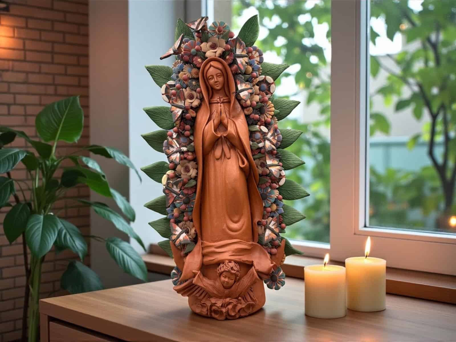 XL Handmade Clay Virgin Mary Sculpture, Mexican Folk Art, 23.7"
