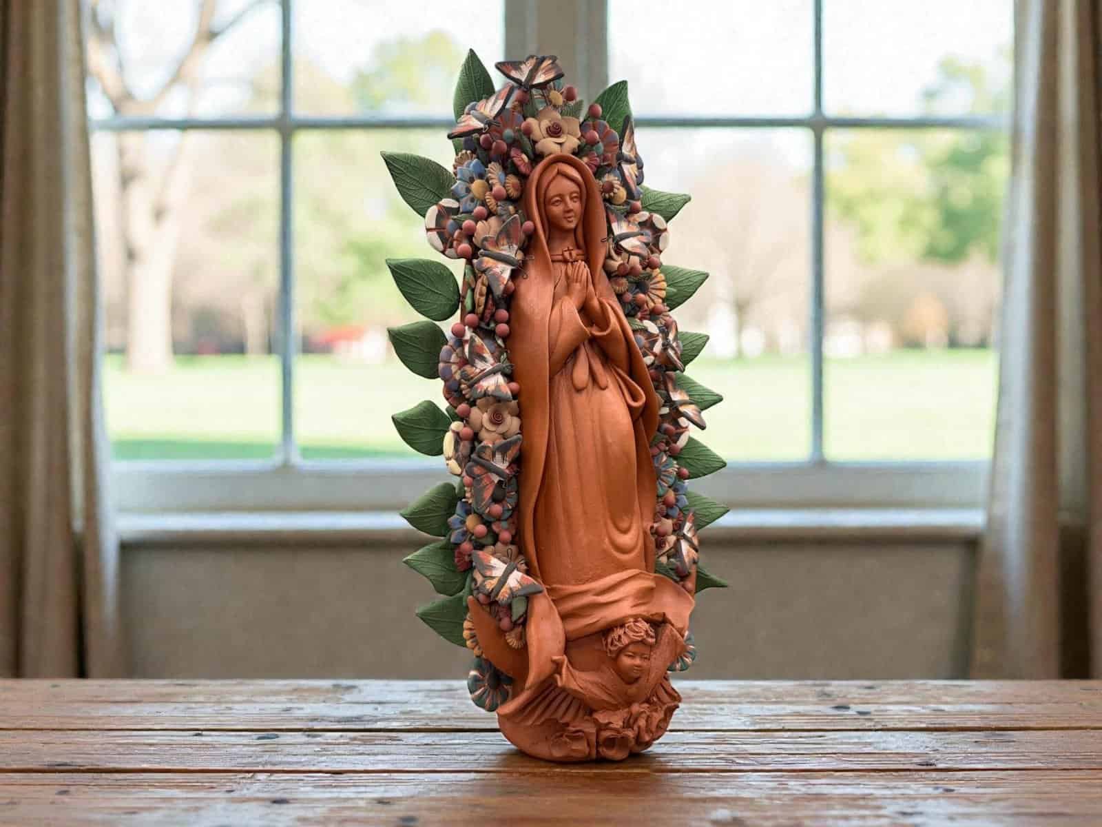 This handcrafted clay Virgin is a stunning representation of Mexican folk art, lovingly made by talented artisans in Metepec, Estado de México. Famous for its barro (clay) traditions, Metepec is a vibrant town where cultural heritage and craftsmanship are deeply rooted in every piece. Each Virgin is carefully shaped and painted by hand, featuring intricate details and warm earthy tones that reflect the spiritual and artistic essence of the region.