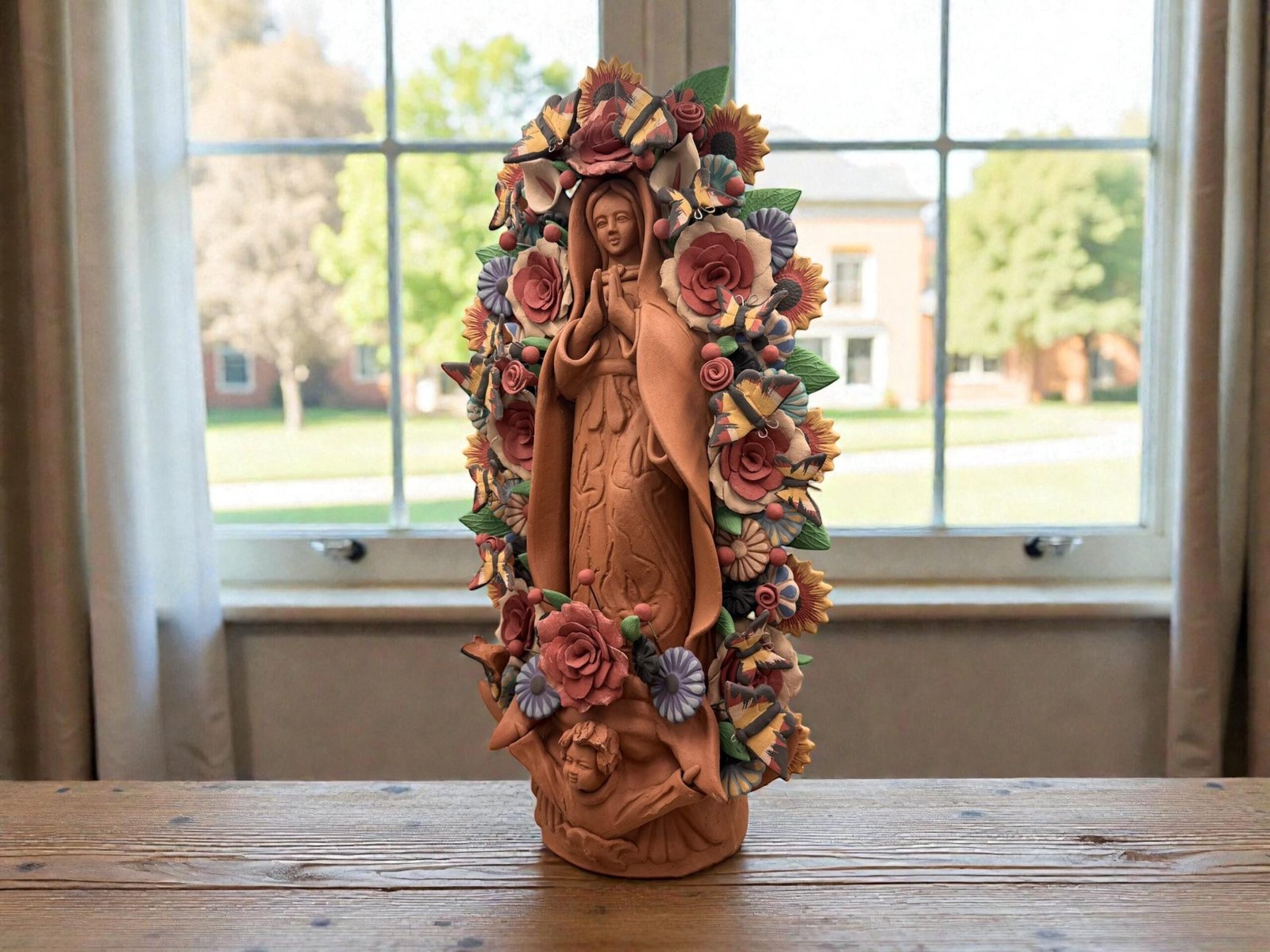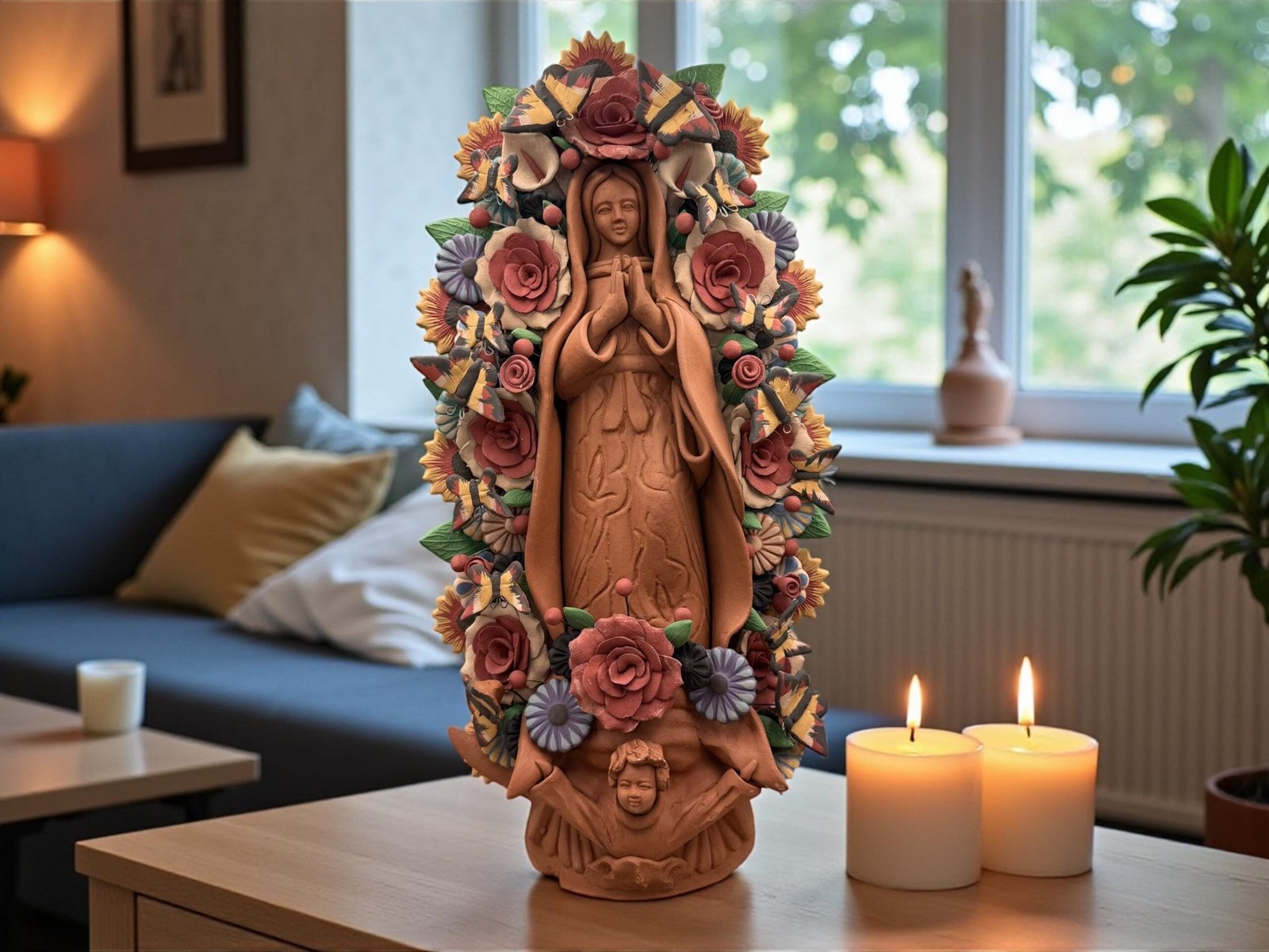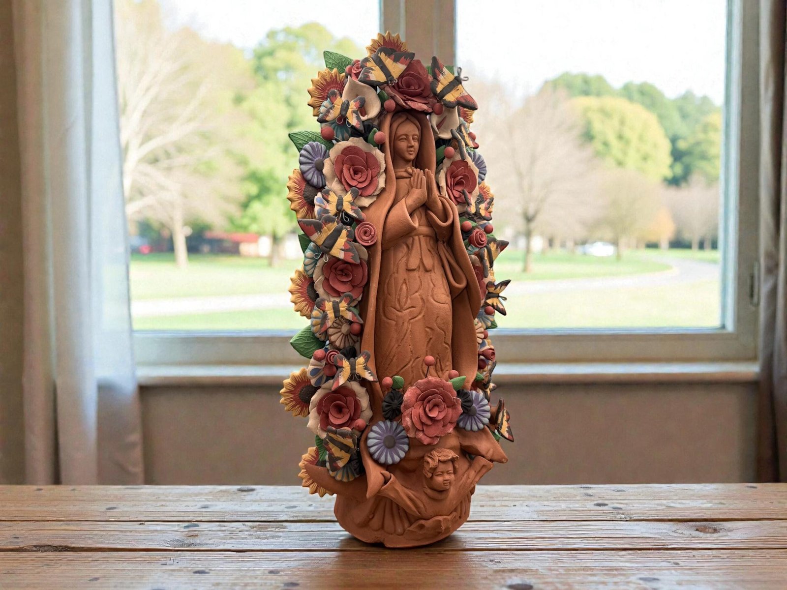 XL Handmade Clay Virgin Mary Sculpture, Mexican Folk Art, 23.7"