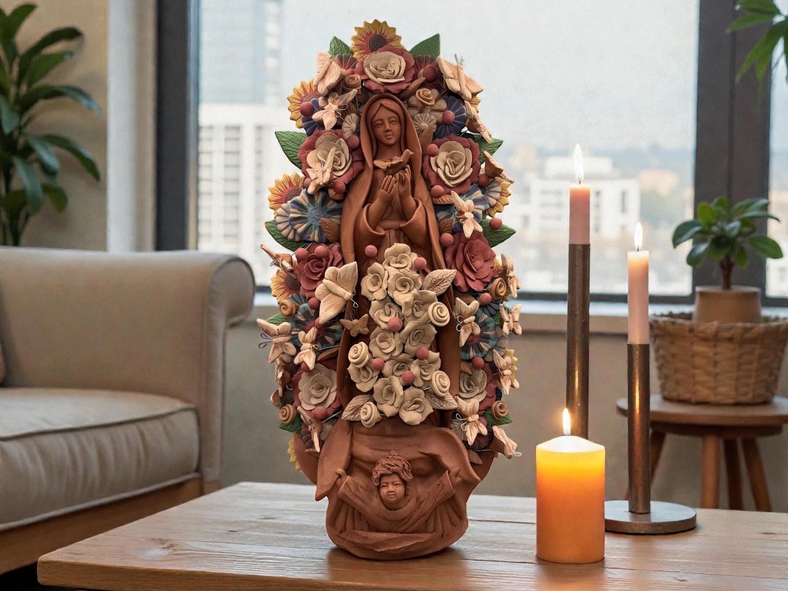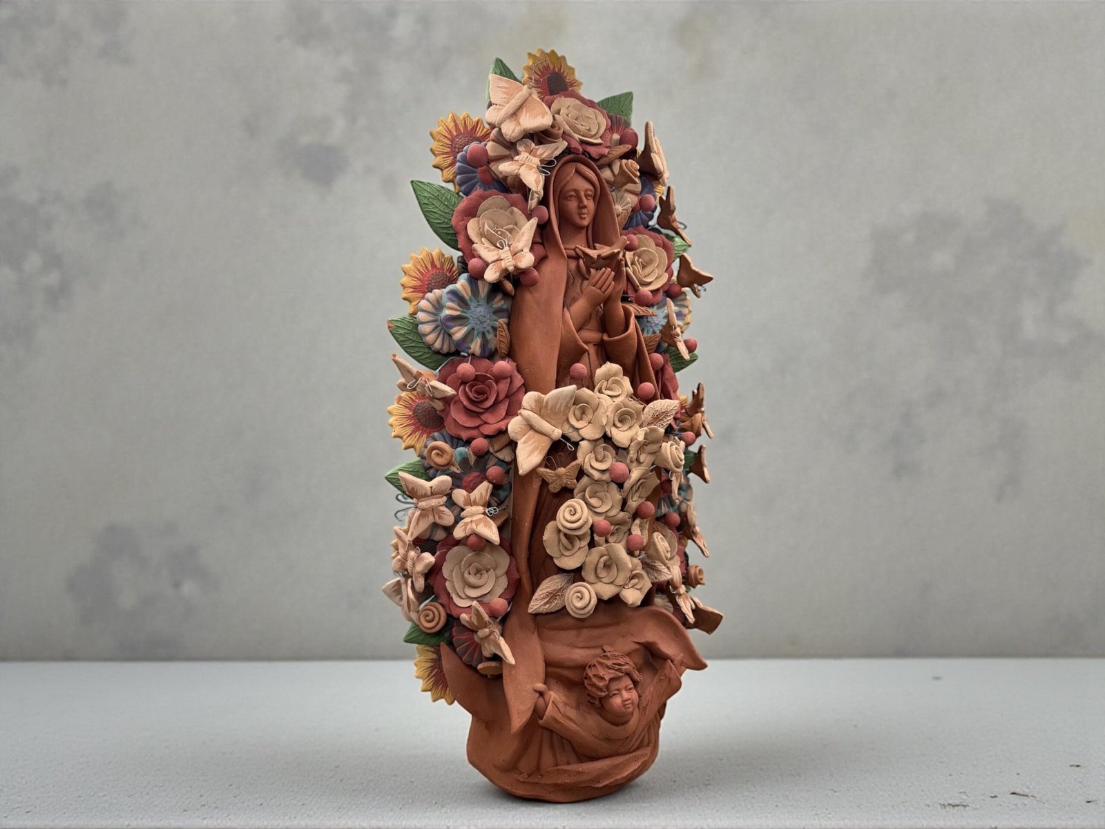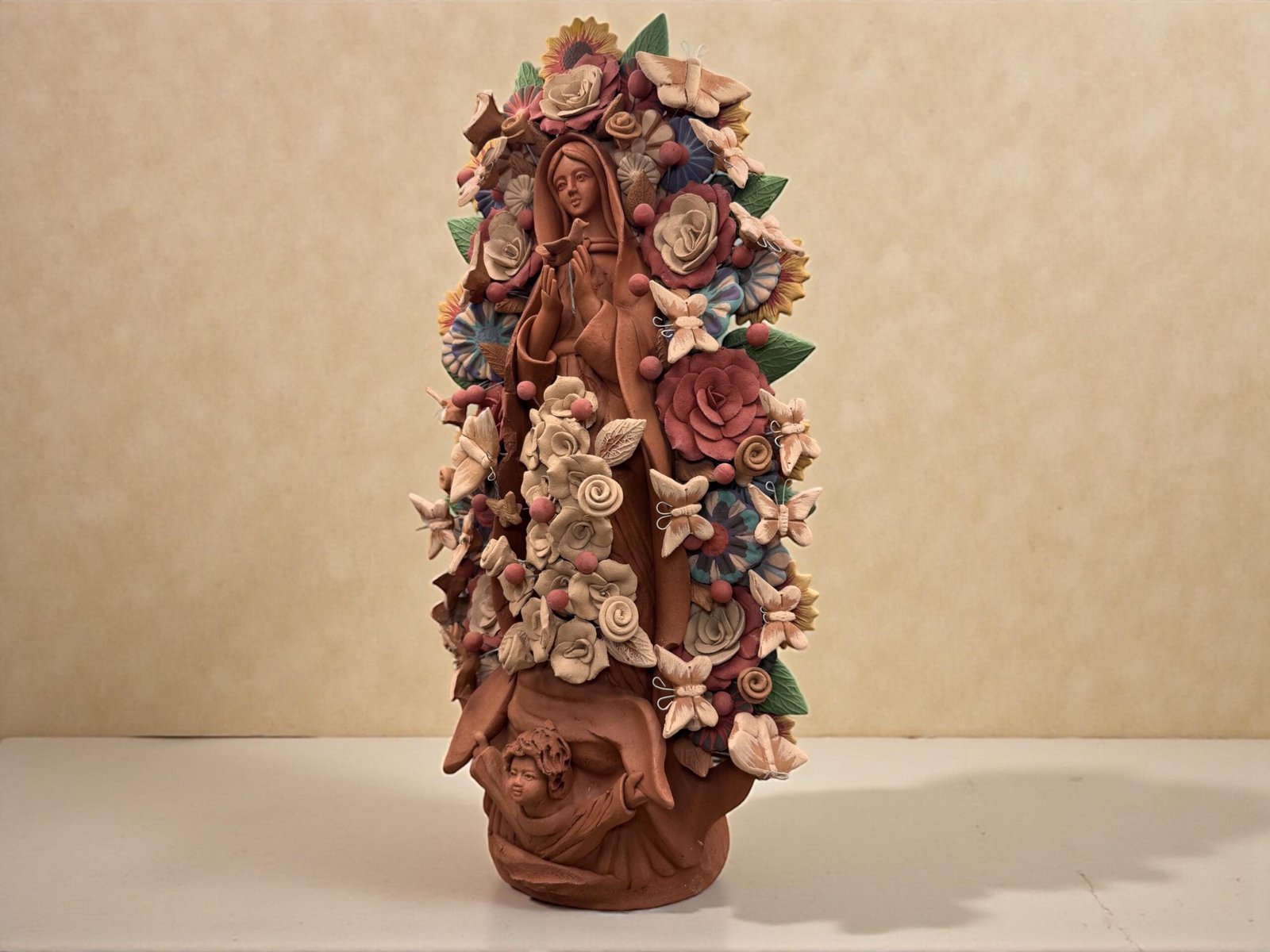 Mary Virgin with flowers decoration ideal to decorate your home or as a special gift, characteristic: – Handmade by Mexican artisans – clay material – clay natural colors – Dimentions 23.7” Tall This handcrafted clay Virgin is a stunning representation of Mexican folk art, lovingly made by talented artisans in Metepec, Estado de México. Famous for its barro (clay) traditions, Metepec is a vibrant town where cultural heritage and craftsmanship are deeply rooted in every piece. Each Virgin is carefully shaped and painted by hand, featuring intricate details and warm earthy tones that reflect the spiritual and artistic essence of the region. This beautiful figure brings a sacred, heartfelt presence to any home, altar, or devotional space. It’s not just a decoration—it’s a meaningful connection to tradition, faith, and the hands that created it. Every piece is unique, with slight variations in color and expression, adding to its authenticity and charm. Perfect as a gift or a treasured part of your own spiritual collection.