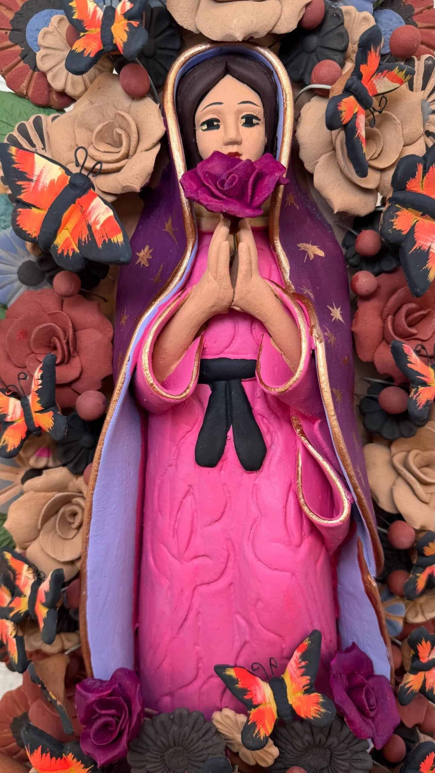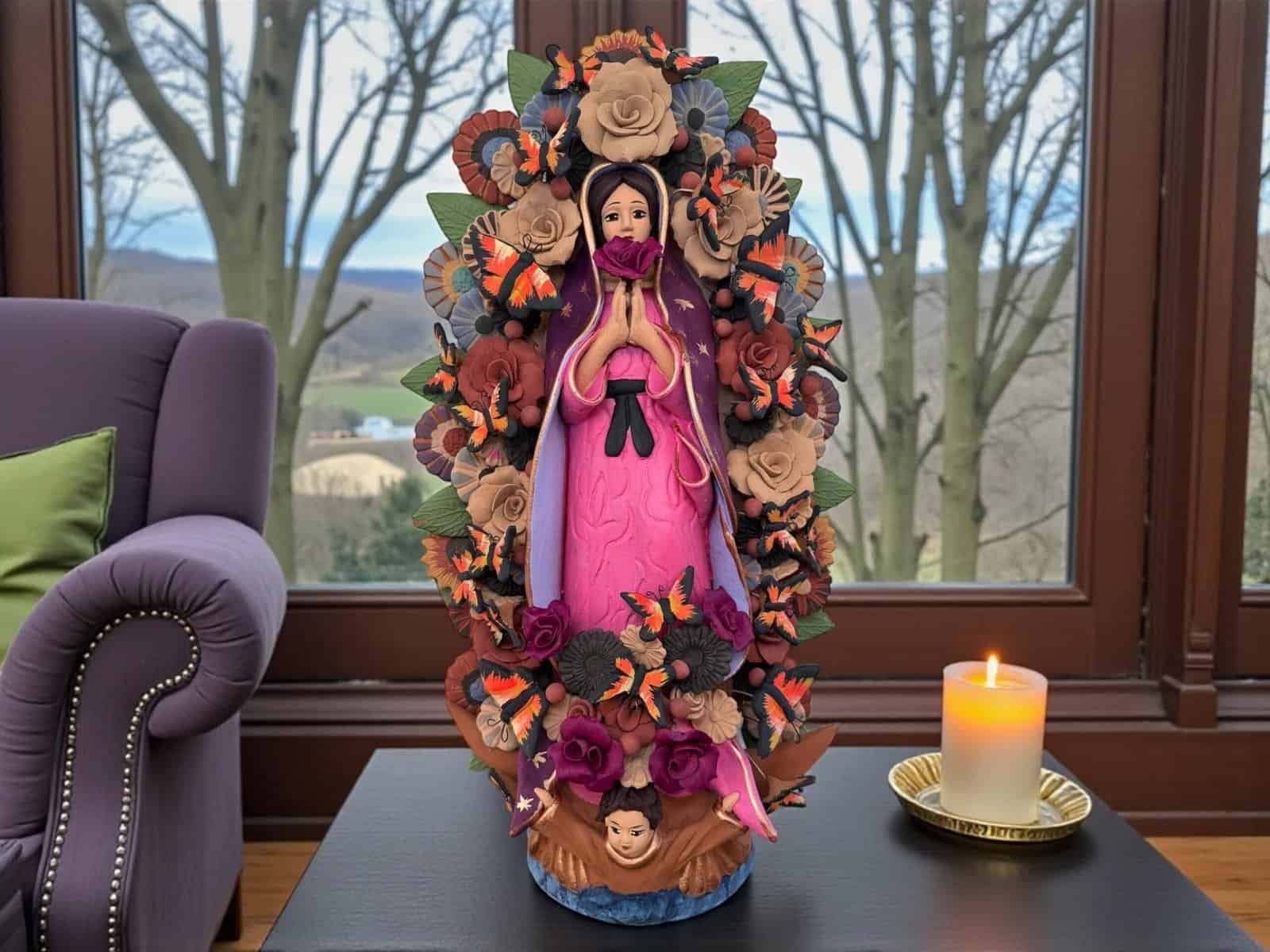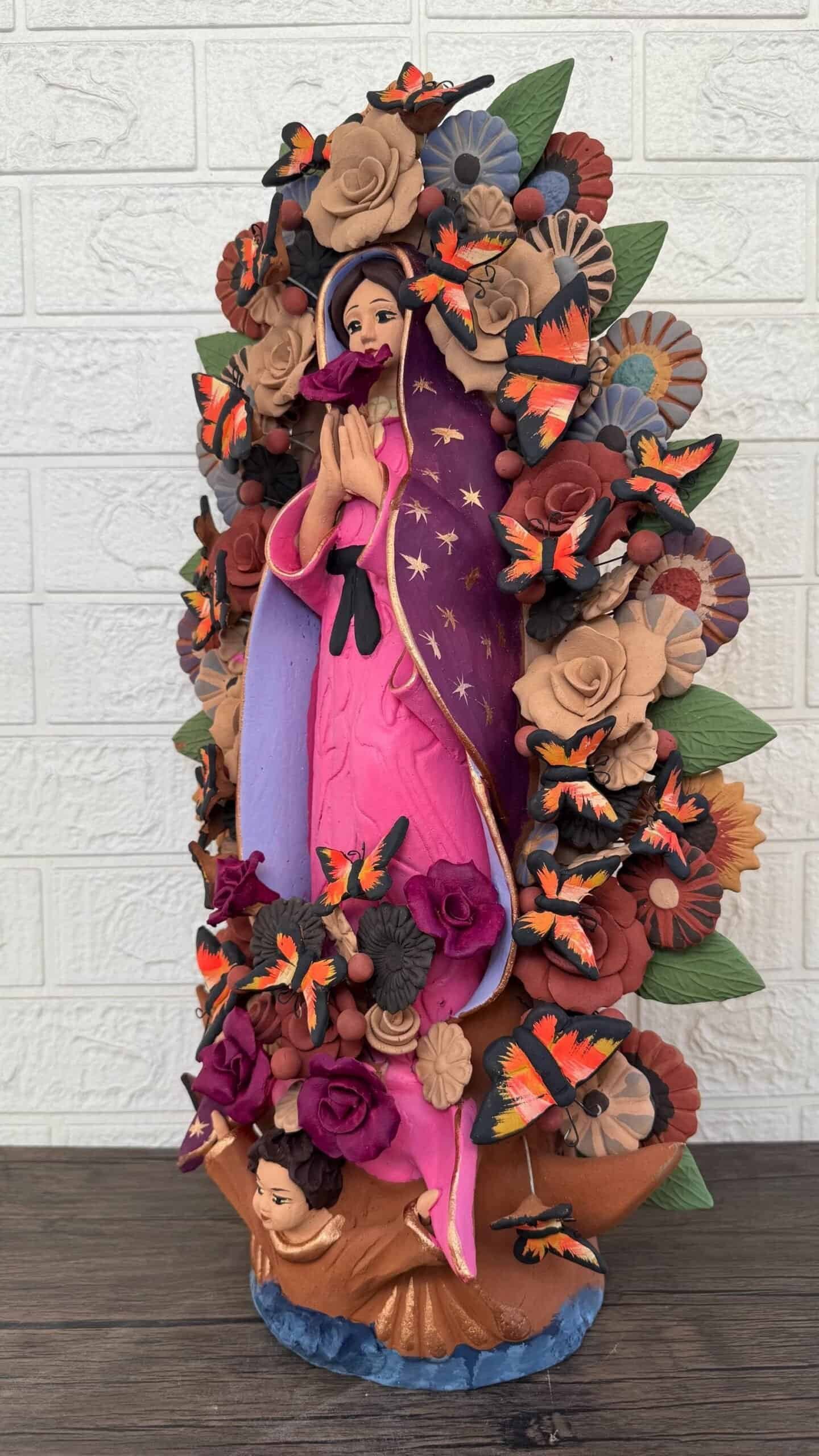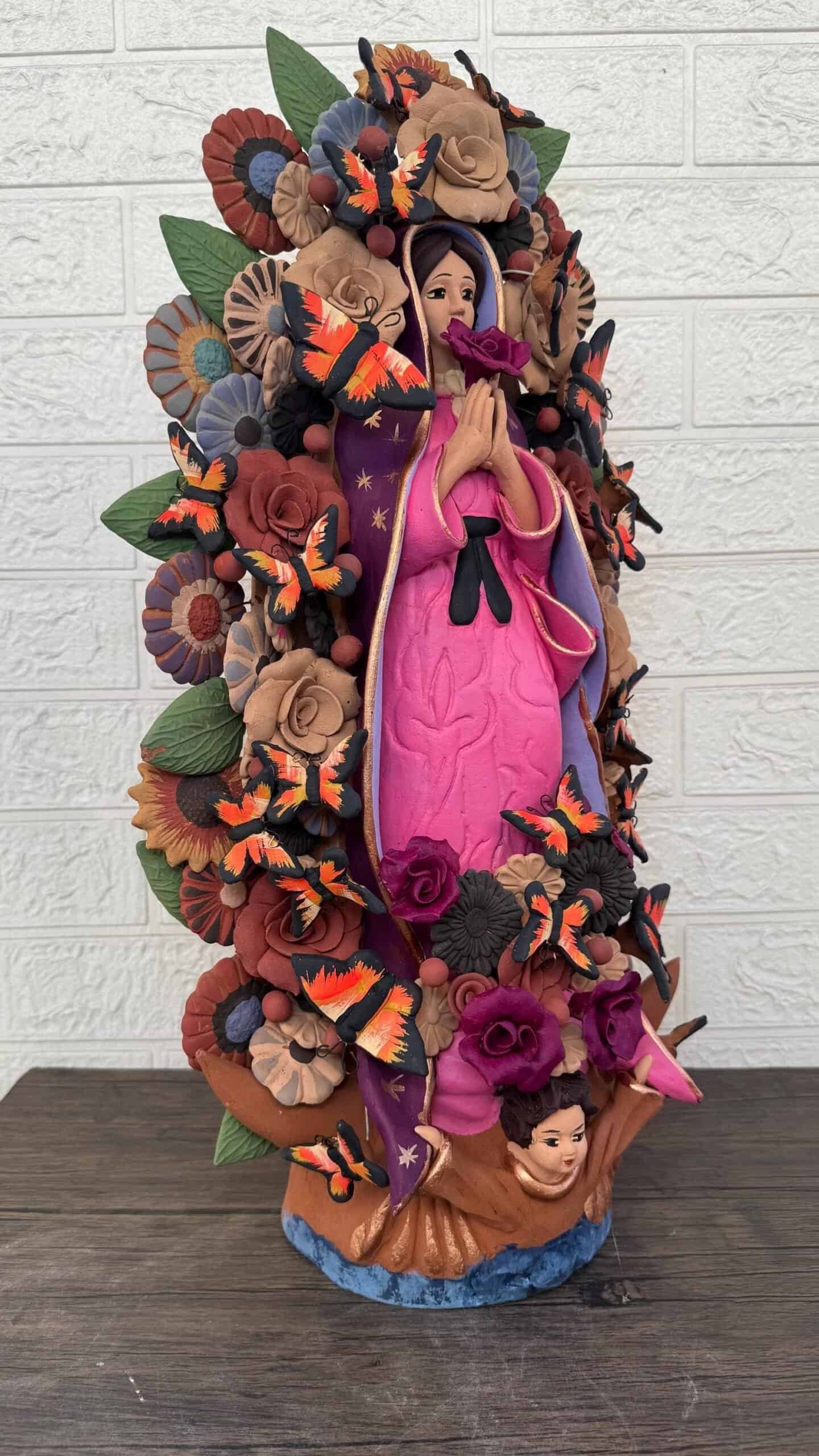 Mary Virgin with flowers decoration ideal to decorate your home or as a special gift, characteristic: – Handmade by Mexican artisans – clay material – clay natural colors – Dimentions 23.7” Tall This handcrafted clay Virgin is a stunning representation of Mexican folk art, lovingly made by talented artisans in Metepec, Estado de México. Famous for its barro (clay) traditions, Metepec is a vibrant town where cultural heritage and craftsmanship are deeply rooted in every piece. Each Virgin is carefully shaped and painted by hand, featuring intricate details and warm earthy tones that reflect the spiritual and artistic essence of the region. This beautiful figure brings a sacred, heartfelt presence to any home, altar, or devotional space. It’s not just a decoration—it’s a meaningful connection to tradition, faith, and the hands that created it. Every piece is unique, with slight variations in color and expression, adding to its authenticity and charm. Perfect as a gift or a treasured part of your own spiritual collection.