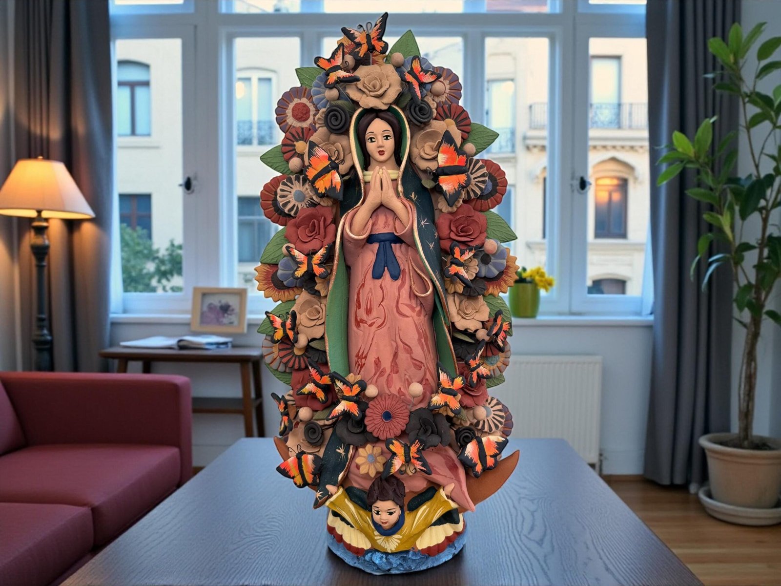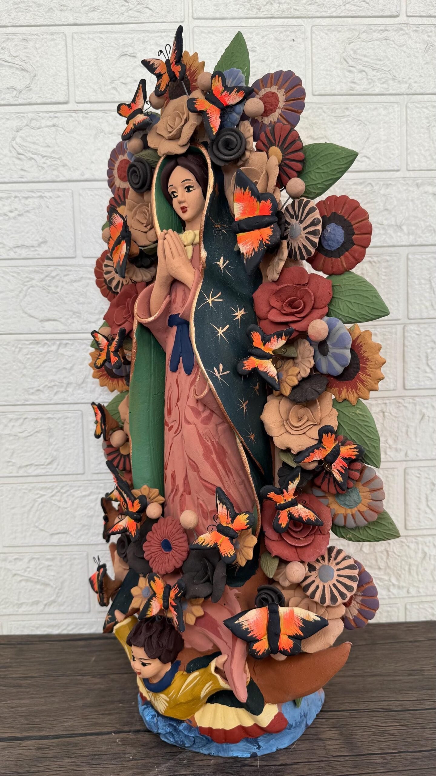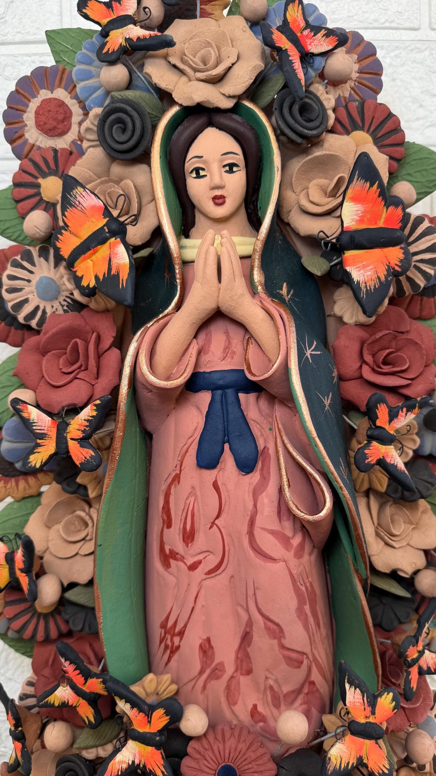 Mary Virgin with flowers decoration ideal to decorate your home or as a special gift, characteristic: – Handmade by Mexican artisans – clay material – clay natural colors – Dimentions 23.7” Tall This handcrafted clay Virgin is a stunning representation of Mexican folk art, lovingly made by talented artisans in Metepec, Estado de México. Famous for its barro (clay) traditions, Metepec is a vibrant town where cultural heritage and craftsmanship are deeply rooted in every piece. Each Virgin is carefully shaped and painted by hand, featuring intricate details and warm earthy tones that reflect the spiritual and artistic essence of the region. This beautiful figure brings a sacred, heartfelt presence to any home, altar, or devotional space. It’s not just a decoration—it’s a meaningful connection to tradition, faith, and the hands that created it. Every piece is unique, with slight variations in color and expression, adding to its authenticity and charm. Perfect as a gift or a treasured part of your own spiritual collection.